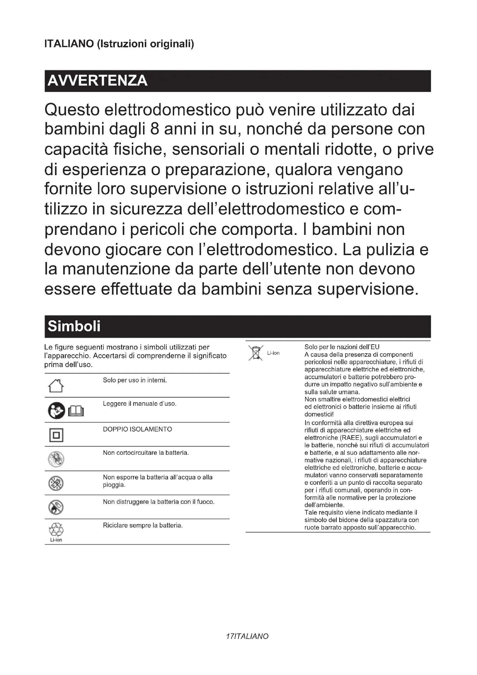 ► Abb.617 ITALIANO ITALIANO (Istruzioni originali) AVVERTENZA Questo elettrodomestico può venire utilizzato dai bambini dagli 8 anni in su, nonché da persone con capacità siche, sensoriali o mentali ridotte, o prive di esperienza o preparazione, qualora vengano fornite loro supervisione o istruzioni relative all’u- tilizzo in sicurezza dell’elettrodomestico e com- prendano i pericoli che comporta. I bambini non devono giocare con l’elettrodomestico. La pulizia e la manutenzione da parte dell’utente non devono essere eettuate da bambini senza supervisione. Simboli Le gure seguenti mostrano i simboli utilizzati per l’apparecchio. Accertarsi di comprenderne il signicato prima dell’uso. Solo per uso in interni. Leggere il manuale d’uso. DOPPIO ISOLAMENTO Non cortocircuitare la batteria. Non esporre la batteria all’acqua o alla pioggia. Non distruggere la batteria con il fuoco. Riciclare sempre la batteria. Li-ion Solo per le nazioni dell’EU A causa della presenza di componenti pericolosi nelle apparecchiature, i riuti di apparecchiature elettriche ed elettroniche, accumulatori e batterie potrebbero pro- durre un impatto negativo sull’ambiente e sulla salute umana. Non smaltire elettrodomestici elettrici ed elettronici o batterie insieme ai riuti domestici! In conformità alla direttiva europea sui riuti di apparecchiature elettriche ed elettroniche (RAEE), sugli accumulatori e le batterie, nonché sui riuti di accumulatori e batterie, e al suo adattamento alle nor- mative nazionali, i riuti di apparecchiature elettriche ed elettroniche, batterie e accu- mulatori vanno conservati separatamente e conferiti a un punto di raccolta separato per i riuti comunali, operando in con- formità alle normative per la protezione dell’ambiente. Tale requisito viene indicato mediante il simbolo del bidone della spazzatura con ruote barrato apposto sull’apparecchio.18 ITALIANO ► Fig.1 Pronto a caricare. Carica ritardata (batteria in rareddamento, batteria troppo fredda o in attesa di carica). Carica in corso (da 0 all’80%). Carica in corso (dall’80 al 100%). Carica completata. Carica in corso (anomalia di rareddamento). Batteria difettosa. ATTENZIONE