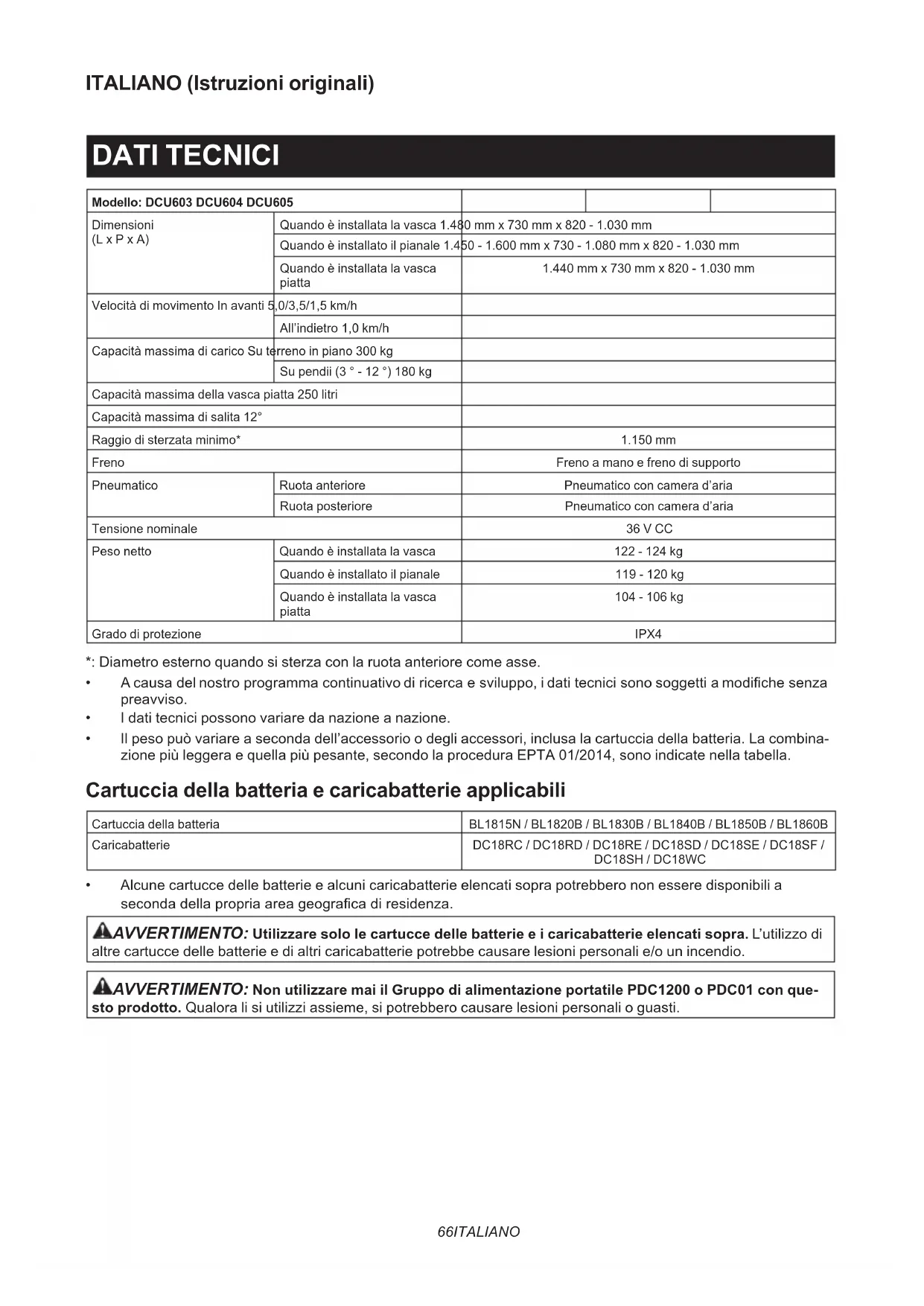 NOTA: Il valore o i valori complessivi delle vibra- zioni dichiarati sono stati misurati in conformità a un metodo standard di verica, e possono essere utiliz- zati per confrontare un utensile con un altro. NOTA: Il valore o i valori complessivi delle vibrazioni dichiarati possono venire utilizzati anche per una valutazione preliminare dell’esposizione. AVVERTIMENTO: L’emissione delle vibrazioni durante l’utilizzo eettivo dell’utensile elettrico può variare rispetto al valore o ai valori dichiarati, a seconda dei modi in cui viene utilizzato l’utensile, specialmente a seconda di che tipo di pezzo venga lavorato. AVVERTIMENTO: Accertarsi di identicare misure di sicurezza per la protezione dell’opera- tore che siano basate su una stima dell’esposi- zione nelle condizioni eettive di utilizzo (tenendo conto di tutte le parti del ciclo operativo, ad esem- pio del numero di spegnimenti dell’utensile e di quando giri a vuoto, oltre al tempo di attivazione). Dichiarazioni di conformità Solo per i paesi europei Le Dichiarazioni di conformità sono incluse nell’Allegato A al presente manuale d’uso. AVVERTENZE DI SICUREZZA Avvertenze generali relative alla sicurezza dell’utensile elettrico AVVERTIMENTO: Leggere tutte le avvertenze di sicurezza, le istruzioni, le illustrazioni e i dati tecnici forniti con il presente utensile elettrico. La mancata osservanza di tutte le istruzioni elencate di seguito potrebbe risultare in scosse elettriche, incendi e/o gravi lesioni personali. Conservare tutte le avvertenze e le istruzioni come riferimento futuro. Il termine “utensile elettrico” nelle avvertenze si riferisce sia all’utensile elettrico (cablato) nel funzionamento alimentato da rete elettrica che all’utensile elettrico (a batteria) nel funzionamento alimentato a batteria. Avvertenze per la sicurezza relative alla carriola elettrica a batteria