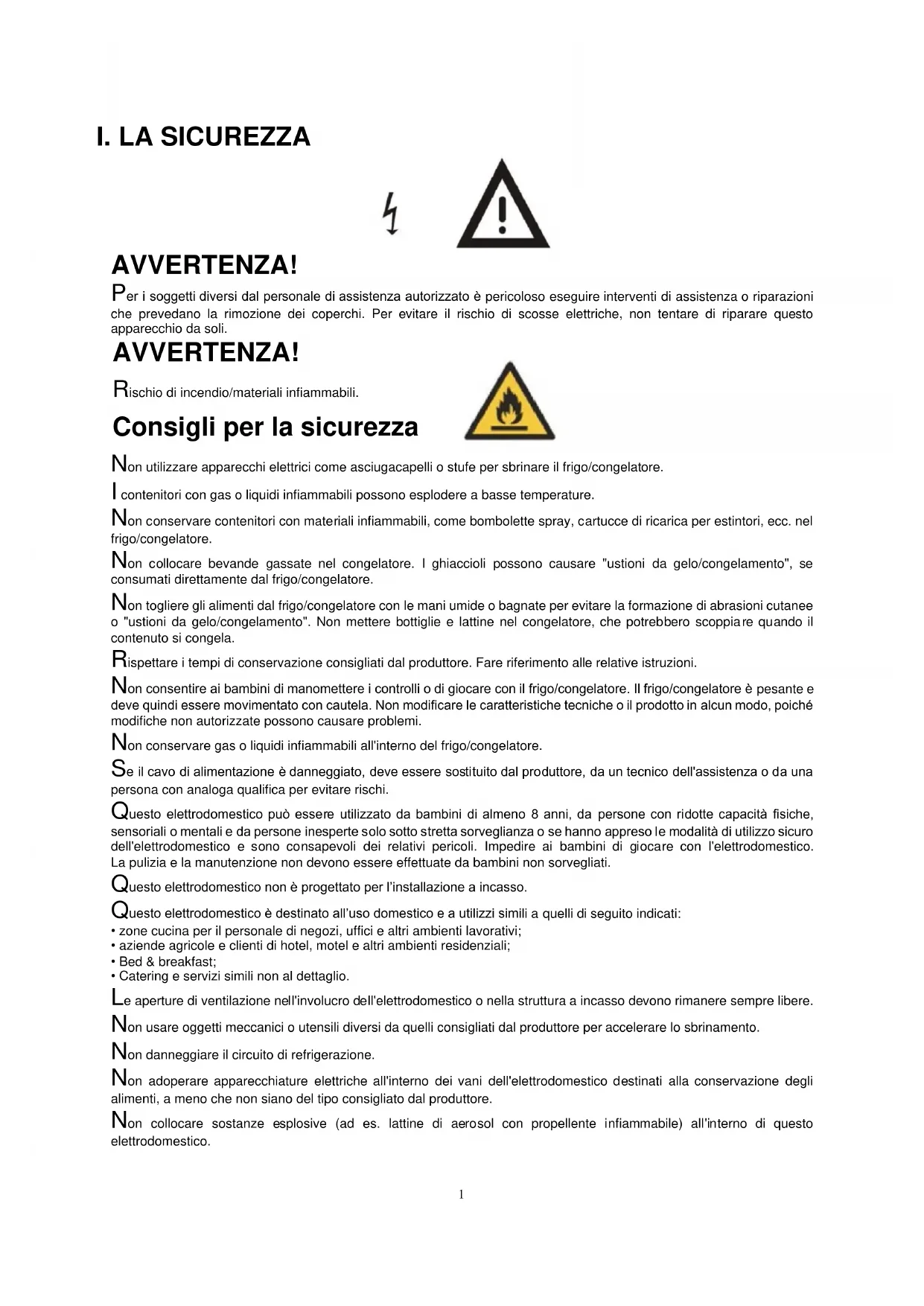 AVVERTENZA! Per i soggetti diversi dal personale di assistenza autorizzato è pericoloso eseguire interventi di assistenza o riparazioni che prevedano la rimozione dei coperchi. Per evitare il rischio di scosse elettriche, non tentare di riparare questo apparecchio da soli. AVVERTENZA! Rischio di incendio/materiali infiammabili. Consigli per la sicurezza Non utilizzare apparecchi elettrici come asciugacapelli o stufe per sbrinare il frigo/congelatore. I contenitori con gas o liquidi infiammabili possono esplodere a basse temperature. Non conservare contenitori con materiali infiammabili, come bombolette spray, cartucce di ricarica per estintori, ecc. nel frigo/congelatore. Non collocare bevande gassate nel congelatore. I ghiaccioli possono causare "ustioni da gelo/congelamento", se consumati direttamente dal frigo/congelatore. Non togliere gli alimenti dal frigo/congelatore con le mani umide o bagnate per evitare la formazione di abrasioni cutanee o "ustioni da gelo/congelamento". Non mettere bottiglie e lattine nel congelatore, che potrebbero scoppiare quando il contenuto si congela. Rispettare i tempi di conservazione consigliati dal produttore. Fare riferimento alle relative istruzioni. Non consentire ai bambini di manomettere i controlli o di giocare con il frigo/congelatore. Il frigo/congelatore è pesante e deve quindi essere movimentato con cautela. Non modificare le caratteristiche tecniche o il prodotto in alcun modo, poiché modifiche non autorizzate possono causare problemi. Non conservare gas o liquidi infiammabili all'interno del frigo/congelatore. Se il cavo di alimentazione è danneggiato, deve essere sostituito dal produttore, da un tecnico dell'assistenza o da una persona con analoga qualifica per evitare rischi. Questo elettrodomestico può essere utilizzato da bambini di almeno 8 anni, da persone con ridotte capacità fisiche, sensoriali o mentali e da persone inesperte solo sotto stretta sorveglianza o se hanno appreso le modalità di utilizzo sicuro dell'elettrodomestico e sono consapevoli dei relativi pericoli. Impedire ai bambini di giocare con l'elettrodomestico. La pulizia e la manutenzione non devono essere effettuate da bambini non sorvegliati. Questo elettrodomestico non è progettato per l’installazione a incasso. Questo elettrodomestico è destinato all’uso domestico e a utilizzi simili a quelli di seguito indicati: