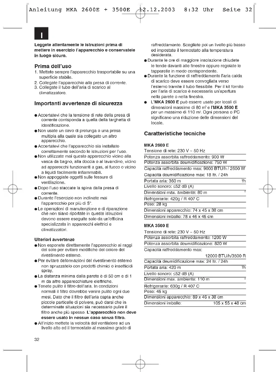 Refrigerante: 420g / R 407 C Peso: 28 kg Dimensioni apparecchio: 74 x 45 x 38 cm Dimensioni imballo: 78 x 46 x 45 cm MKA 3500 E Tensione di rete: 230 V ~ 50 Hz Potenza assorbita raffreddamento: 1200 W Potenza assorbita deumidificazione: 820 W Capacità raffreddamento max: 12000 BTU/h/3500 R Capacità deumidificazione max: 24 ltr. / 24h Portata aria: 420 m