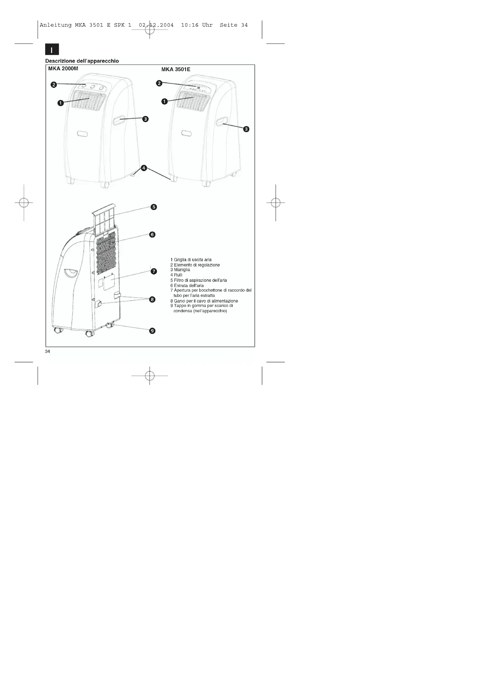 Descrizione dell’apparecchio Anleitung MKA 3501 E SPK 1 02.12.2004 10:16 Uhr Seite 34*Leggete attentamente le istruzioni prima di mettere in esercizio l’apparecchio e conservatele in luogo sicuro. Con l’acquisto di questo climatizzatore mobile avete fatto una buona scelta Si tratta di un apparecchio progettato in modo professionale che offre a lungo un massimo di confort a condizione che venga usato secondo le istruzioni. Leggete attentamente le istruzioni e conservatele in un luogo sicuro per consultarle anche in seguito. Prima dell’uso