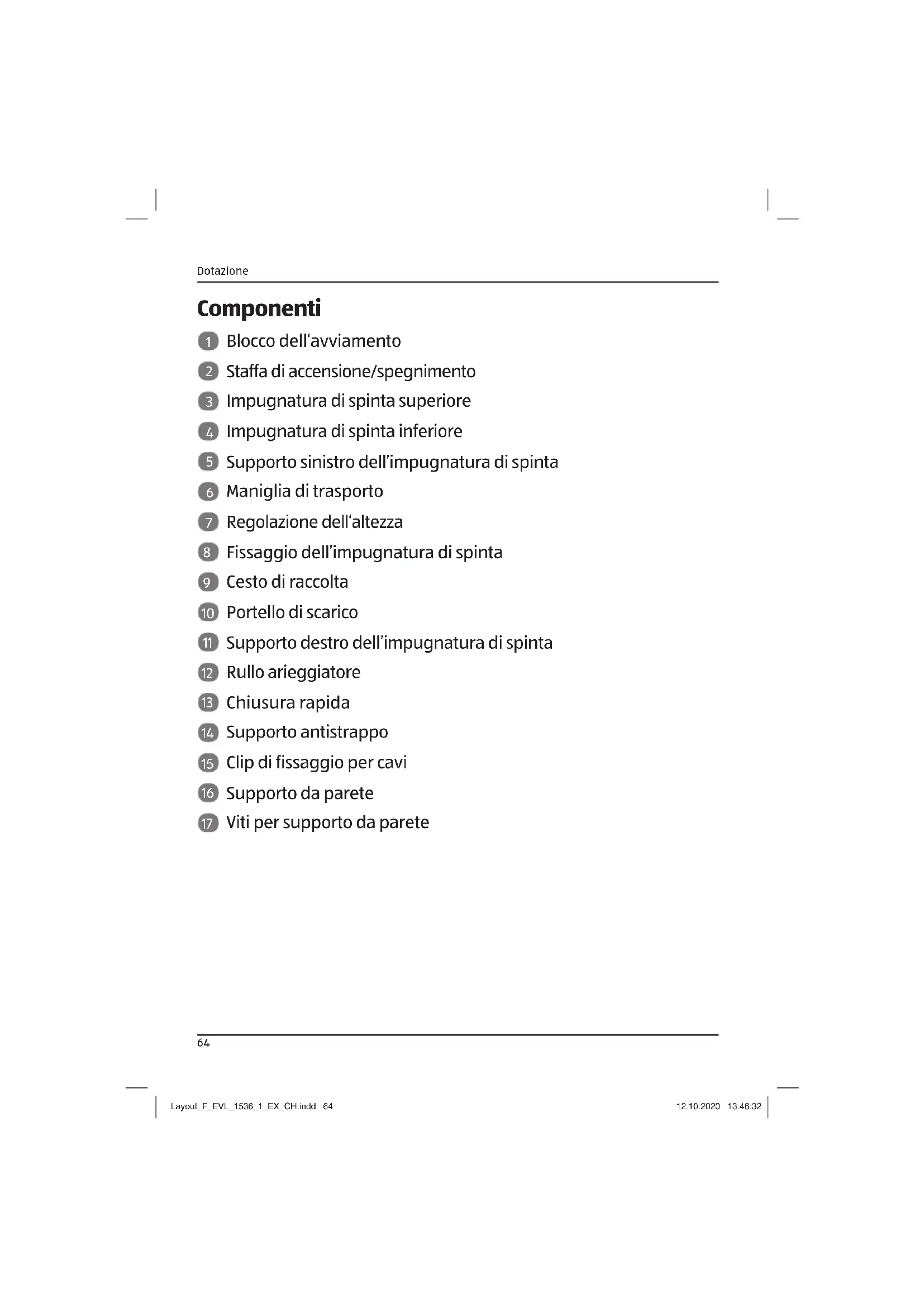 - Muovete lo scarificatore solo a passo d‘uomo. Layout_F_EVL_1536_1_EX_CH.indd 77Layout_F_EVL_1536_1_EX_CH.indd 77 12.10.2020 13:46:3212.10.2020 13:46:3278 Utilizzo