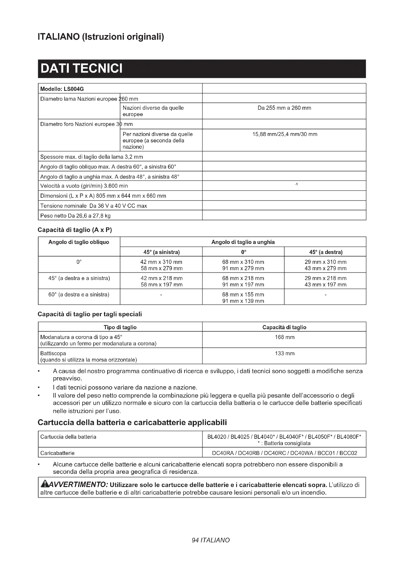 Quando si intende eseguire un taglio a unghia, ruotare innanzitutto la manopola in senso antiorario, quindi inclinare il carrello. Dopodiché, ruotare la manopola in senso orario per serrarla. Quando si intende eseguire un taglio a scorrimento, innanzitutto tirare completa- mente il carrello e premere verso il basso il manico, quindi spingere il carrello verso la guida pezzo. Tenere premuto il pulsante di sblocco quando si inclina il carrello verso destra. Attivare la leva di fermo quando si intende tagliare un battiscopa con un angolo di taglio obliquo di 45°. Non posizionare la mano o le dita in prossi- mità della lama. Non ssare lo sguardo sulla lampada accesa. A: Diametro lama B: Diametro foro Non installare la morsa orizzontale nella stessa direzione del taglio obliquo. (Questo simbolo è applicato sulla morsa orizzontale.) Ni-MH Li-ion Solo per le nazioni dell’EU A causa della presenza di componenti pericolosi nelle apparecchiature, i riuti di apparecchiature elettriche ed elettroniche, accumulatori e batterie potrebbero pro- durre un impatto negativo sull’ambiente e sulla salute umana. Non smaltire elettrodomestici elettrici ed elettronici o batterie insieme ai riuti domestici! In conformità alla direttiva europea sui riuti di apparecchiature elettriche ed elettroniche (RAEE), sugli accumulatori e le batterie, nonché sui riuti di accumulatori e batterie, e al suo adattamento alle nor- mative nazionali, i riuti di apparecchiature elettriche ed elettroniche, batterie e accu- mulatori vanno conservati separatamente e conferiti a un punto di raccolta separato per i riuti comunali, operando in con- formità alle normative per la protezione dell’ambiente. Tale requisito viene indicato mediante il simbolo del bidone della spazzatura con ruote barrato apposto sull’apparecchio. Utilizzo previsto Questo utensile va utilizzato per eseguire tagli di preci- sione diritti e inclinati del legno. Non utilizzare la sega per tagliare materiali diversi da legno, alluminio o simili. Rumore Livello tipico di rumore pesato A determinato in base allo standard EN62841-3-9: Livello di pressione sonora (L