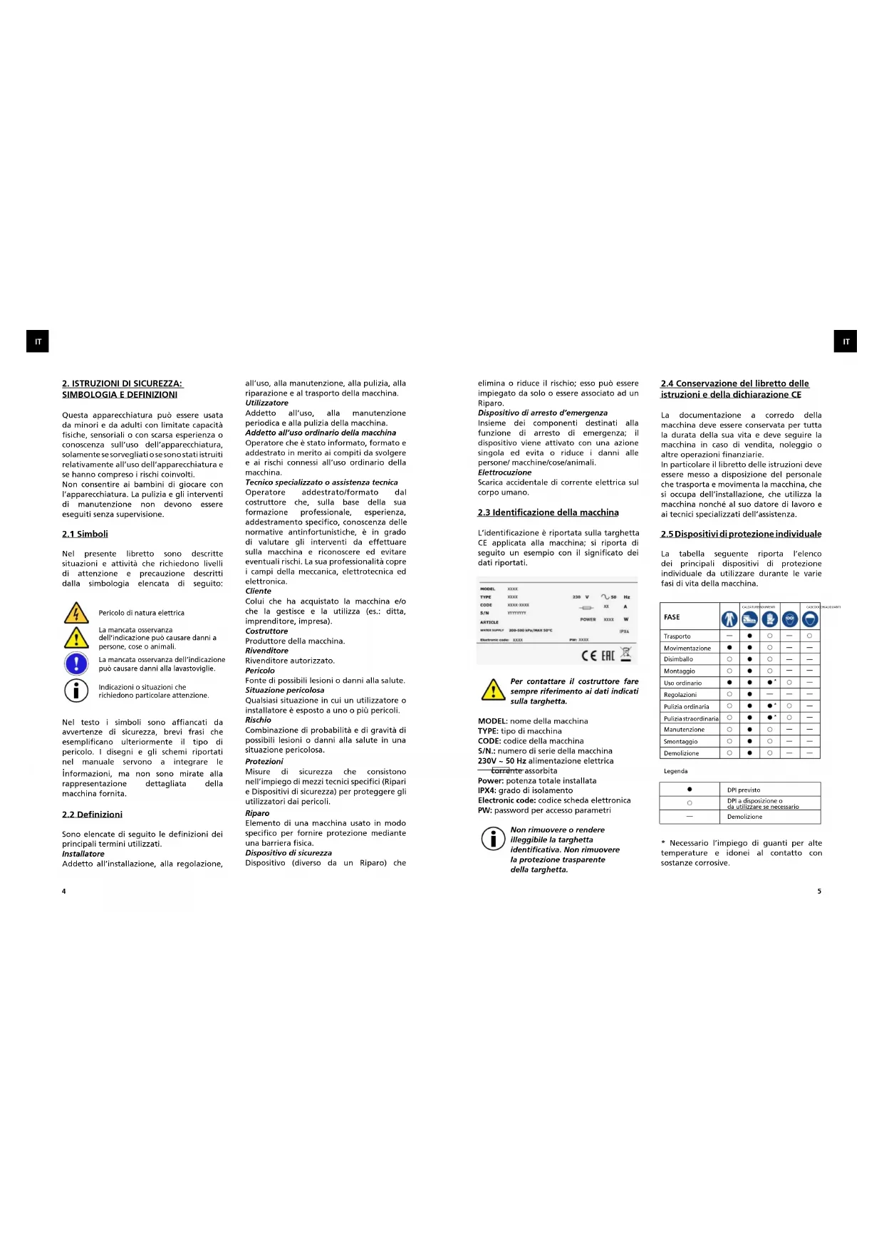 L’identificazione è riportata sulla targhetta CE applicata alla macchina; si riporta di seguito un esempio con il significato dei dati riportati. Per contattare il costruttore fare sempre riferimento ai dati indicati sulla targhetta. MODEL: nome della macchina TYPE: tipo di macchina CODE: codice della macchina S/N.: numero di serie della macchina 230V ~ 50 Hz alimentazione elettrica corrente assorbita Power: potenza totale installata IPX4: grado di isolamento Electronic code: codice scheda elettronica PW: password per accesso parametri Non rimuovere o rendere illeggibile la targhetta identificativa. Non rimuovere la protezione trasparente della targhetta.