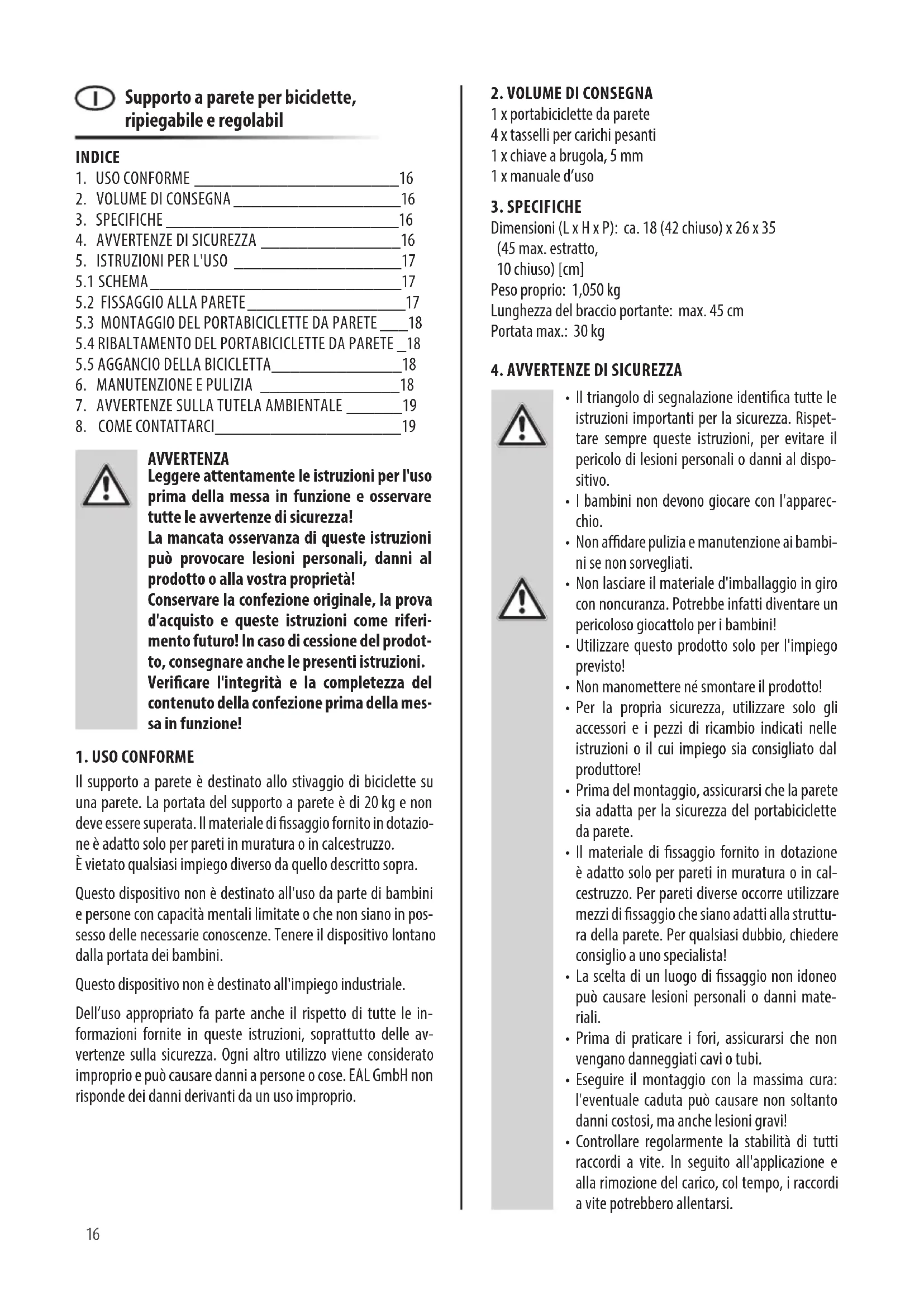 INDICE Leggere attentamente le istruzioni per l'uso prima della messa in funzione e osservare tutte le avvertenze di sicurezza! La mancata osservanza di queste istruzioni può provocare lesioni personali, danni al prodotto o alla vostra proprietà! Conservare la confezione originale, la prova d'acquisto e queste istruzioni come riferi- mento futuro! In caso di cessione del prodot- to, consegnare anche le presenti istruzioni. Vericare l'integrità e la completezza del contenuto della confezione prima della mes- sa in funzione! AVVERTENZA Supporto a parete per biciclette, ripiegabile e regolabil