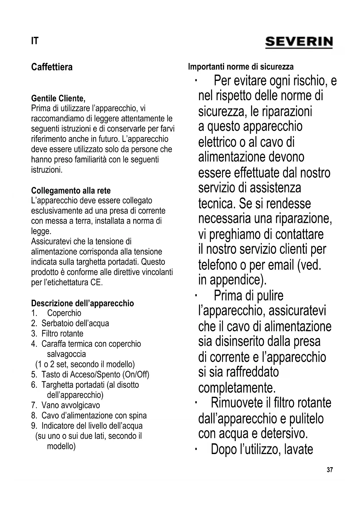 (su uno o sui due lati, secondo il modello) Importanti norme di sicurezza ∙ Per evitare ogni rischio, e nel rispetto delle norme di sicurezza, le riparazioni a questo apparecchio elettrico o al cavo di alimentazione devono essere effettuate dal nostro servizio di assistenza tecnica. Se si rendesse necessaria una riparazione, vi preghiamo di contattare il nostro servizio clienti per telefono o per email (ved. in appendice). ∙ Prima di pulire l’apparecchio, assicuratevi che il cavo di alimentazione sia disinserito dalla presa di corrente e l’apparecchio si sia raffreddato completamente. ∙ Rimuoveteilltrorotante dall’apparecchio e pulitelo con acqua e detersivo. ∙ Dopo l’utilizzo, lavate IT38 104 x 142 mm l’interno della caraffa termica e pulite la parte esterna con un panno umido. ∙ Per informazioni più dettagliate su come pulire l’apparecchio, consultate la sezione Manutenzione e pulizia. ∙ Per evitare eventuali rischi di scosse elettriche, non pulite l’apparecchio con liquidi e non immergetelo in sostanze liquide. ∙ Avvertenza! Il cattivo uso può essere causa di gravi lesioni alla persona. ∙ Avvertenza:Lesuperci accessibili diventano calde durante il funzionamento e rimangono calde per un certo lasso di tempo anche dopo l’uso. ∙ L’apparecchio non deve essere riposto in un armadio mentre è ancora in funzione. ∙ Questo apparecchio è studiato per il solo uso domestico o per impieghi simili, come per esempio - in cucine per il personale, negozi,ufciealtri ambienti simili di lavoro, - in aziende agricole, - da clienti di alberghi, motel e sistemazioni simili, - da clienti di pensioni “bed- and-breakfast” (letto & colazione). ∙ Il presente apparecchio può essere usato da bambini (di almeno 8 anni di età) e da persone con ridotte capacitàsiche,sensoriali o mentali, o persone senza particolari esperienze o conoscenze, purché siano sotto sorveglianza o siano state date loro istruzioni sull’uso dell’apparecchio e104 x 142 mm