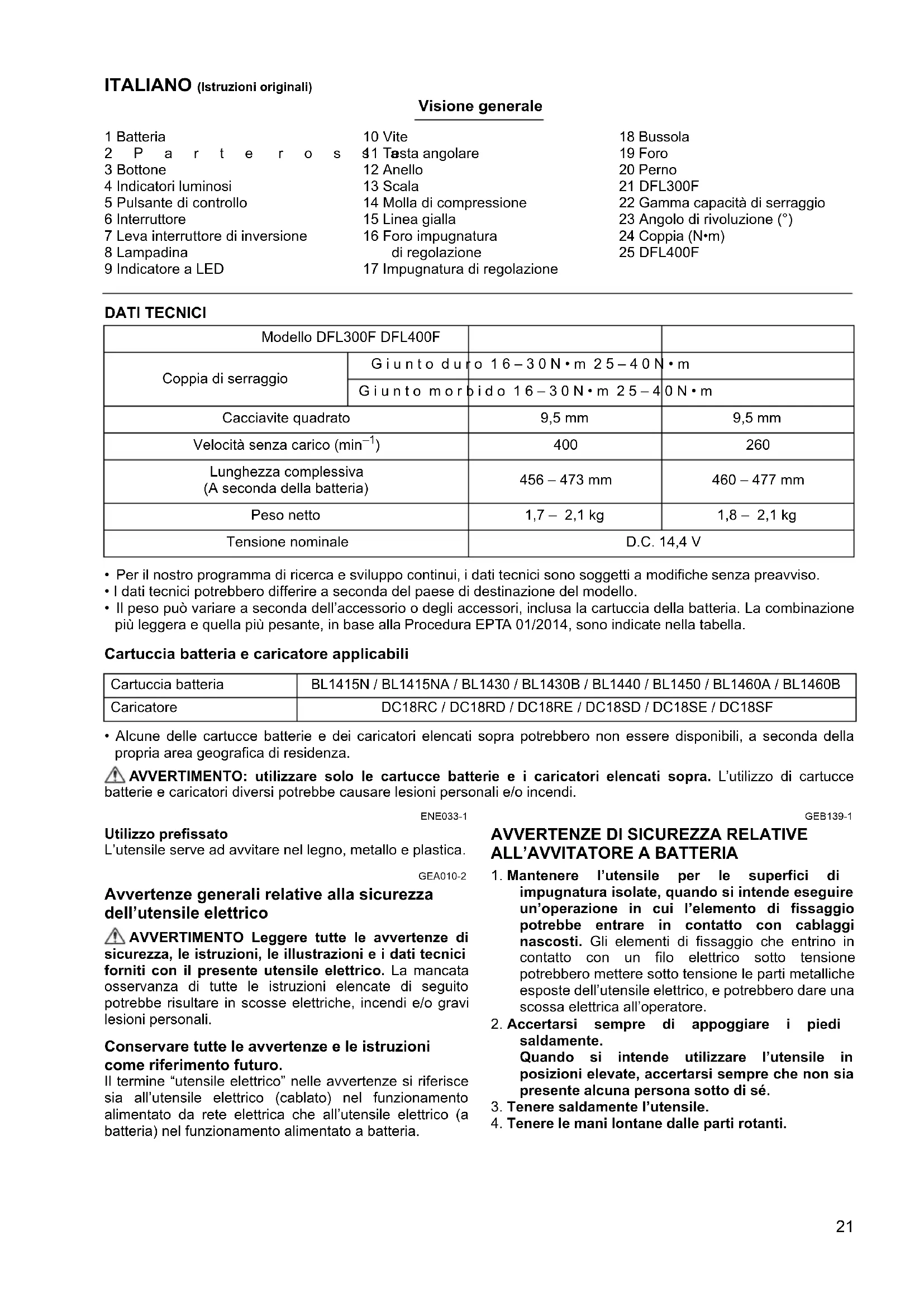 Nur für europäische Länder Die EG-Konformitätserklärung ist als Anhang A in dieser Bedienungsanleitung enthalten.21 ITALIANO (Istruzioni originali) Visione generale 1 Batteria 2Parte rossa 3 Bottone 4 Indicatori luminosi 5 Pulsante di controllo 6 Interruttore 7 Leva interruttore di inversione 8 Lampadina 9 Indicatore a LED 10 Vite 11 Testa angolare 12 Anello 13 Scala 14 Molla di compressione 15 Linea gialla 16 Foro impugnatura di regolazione 17 Impugnatura di regolazione 18 Bussola 19 Foro 20 Perno 21 DFL300F 22 Gamma capacità di serraggio 23 Angolo di rivoluzione (°) 24 Coppia (N•m) 25 DFL400F DATI TECNICI