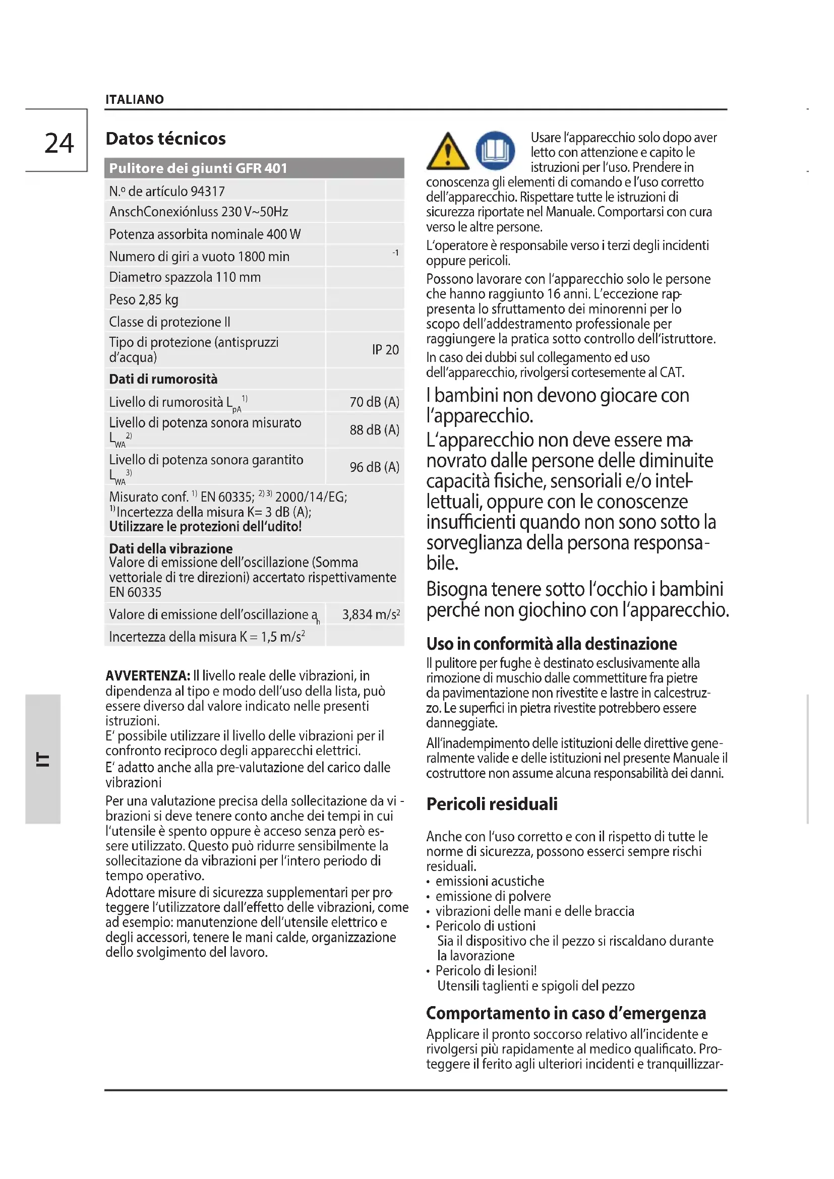 teggere l‘utilizzatore dall‘eetto delle vibrazioni,come ad esempio: manutenzione dell‘utensileelettrico e degli accessori, tenere le manicalde, organizzazione dello svolgimento dellavoro. Usare l‘apparecchio solo dopo aver letto con attenzione e capito le istruzioni per l‘uso. Prendere in conoscenza gli elementi di comando e l’uso corretto dell’apparecchio. Rispettare tutte le istruzioni di sicurezza riportate nel Manuale. Comportarsi con cura verso le altre persone. L‘operatore è responsabile verso i terzi degli incidenti oppure pericoli. Possono lavorare con l‘apparecchiosolo le persone che hannoraggiunto 16 anni. L’eccezionerap