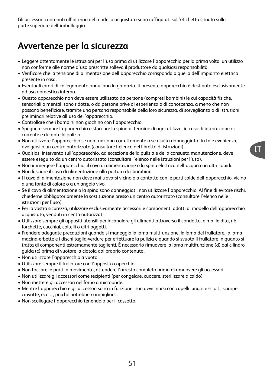 Avvertenze per la sicurezza • Leggere attentamente le istruzioni per l'uso prima di utilizzare l'apparecchio per la prima volta: un utilizzo non conforme alle norme d'uso prescritte solleva il produttore da qualsiasi responsabilità. • Verificare che la tensione di alimentazione dell'apparecchio corrisponda a quella dell'impianto elettrico presente in casa. • Eventuali errori di collegamento annullano la garanzia. Il presente apparecchio è destinato esclusivamente ad uso domestico interno. • Questo apparecchio non deve essere utilizzato da persone (compresi bambini) le cui capacità fisiche, sensoriali o mentali sono ridotte, o da persone prive di esperienza o di conoscenza, a meno che non possano beneficiare, tramite una persona responsabile della loro sicurezza, di sorveglianza o di istruzioni preliminari relative all'uso dell'apparecchio. • Controllare che i bambini non giochino con l’apparecchio. • Spegnere sempre l'apparecchio e staccare la spina al termine di ogni utilizzo, in caso di interruzione di corrente e durante la pulizia. • Non utilizzare l'apparecchio se non funziona correttamente o se risulta danneggiato. In tale evenienza, rivolgersi a un centro autorizzato (consultare l'elenco nel libretto di istruzioni). • Qualsiasi intervento sull’apparecchio, ad eccezione della pulizia e della consueta manutenzione, deve essere eseguito da un centro autorizzato (consultare l'elenco nelle istruzioni per l’uso). • Non immergere l'apparecchio, il cavo di alimentazione o la spina elettrica nell’acqua o in altri liquidi. • Non lasciare il cavo di alimentazione alla portata dei bambini. • Il cavo di alimentazione non deve mai trovarsi vicino o a contatto con le parti calde dell'apparecchio, vicino a una fonte di calore o a un angolo vivo. • Se il cavo di alimentazione o la spina sono danneggiati, non utilizzare l'apparecchio. Al fine di evitare rischi, chiederne obbligatoriamente la sostituzione presso un centro autorizzato (consultare l'elenco nelle istruzioni per l'uso). • Per la vostra sicurezza, utilizzare esclusivamente accessori e componenti adatti al modello dell'apparecchio acquistato, venduti in centri autorizzati. • Utilizzare sempre gli appositi utensili per incanalare gli alimenti attraverso il condotto, e mai le dita, né forchette, cucchiai, coltelli o altri oggetti. • Prendere adeguate precauzioni quando si maneggia la lama multifunzione, la lama del frullatore, la lama macina-erbette e i dischi taglia-verdure per effettuare la pulizia e quando si svuota il frullatore in quanto si tratta di componenti estremamente taglienti. È necessario rimuovere la lama multifunzione (d) dal cilindro guida (c) prima di vuotare la ciotola dal proprio contenuto. • Non utilizzare l'apparecchio a vuoto. • Utilizzare sempre il frullatore con l'apposito coperchio. • Non toccare le parti in movimento, attendere l'arresto completo prima di rimuovere gli accessori. • Non utilizzare gli accessori come recipienti (per congelare, cuocere, sterilizzare a caldo). • Non mettere gli accessori nel forno a microonde. • Mentre l'apparecchio e gli accessori sono in funzione, non avvicinarsi con capelli lunghi e sciolti, sciarpe, cravatte, ecc…, poiché potrebbero impigliarsi. • Non scollegare l’apparecchio tenendolo per il cassetto.