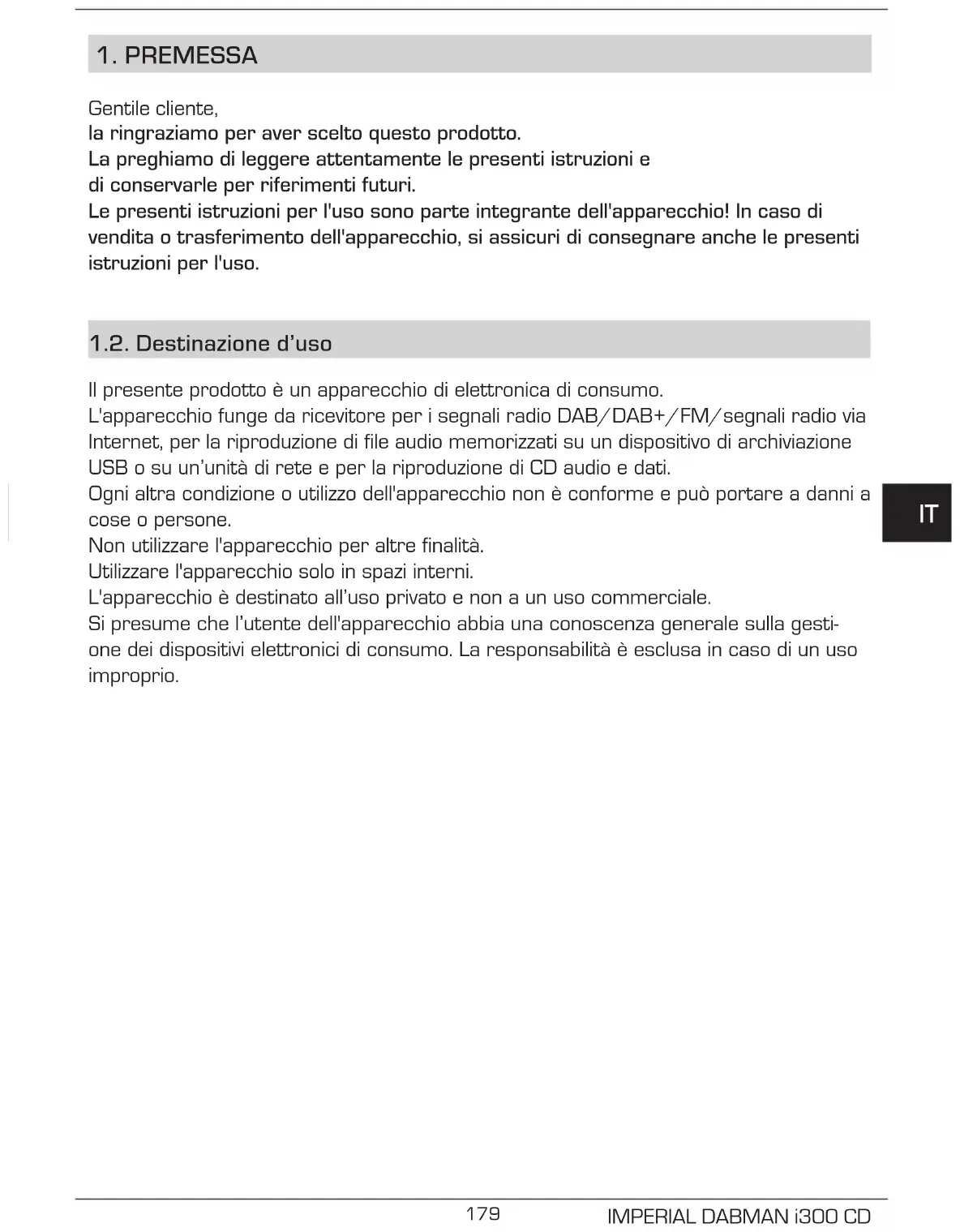 Gentile cliente, la ringraziamo per aver scelto questo prodotto. La preghiamo di leggere attentamente le presenti istruzioni e di conservarle per riferimenti futuri. Le presenti istruzioni per l'uso sono parte integrante dell'apparecchio! In caso di vendita o trasferimento dell'apparecchio, si assicuri di consegnare anche le presenti istruzioni per l'uso. 1.2. Destinazione d’uso Il presente prodotto è un apparecchio di elettronica di consumo. L'apparecchio funge da ricevitore per i segnali radio DAB/DAB+/FM/segnali radio via Internet, per la riproduzione di file audio memorizzati su un dispositivo di archiviazione USB o su un’unità di rete e per la riproduzione di CD audio e dati. Ogni altra condizione o utilizzo dell'apparecchio non è conforme e può portare a danni a cose o persone. Non utilizzare l'apparecchio per altre finalità. Utilizzare l'apparecchio solo in spazi interni. L'apparecchio è destinato all’uso privato e non a un uso commerciale. Si presume che l’utente dell'apparecchio abbia una conoscenza generale sulla gesti- one dei dispositivi elettronici di consumo. La responsabilità è esclusa in caso di un uso improprio.180 Istruzioni per l‘uso NLIT