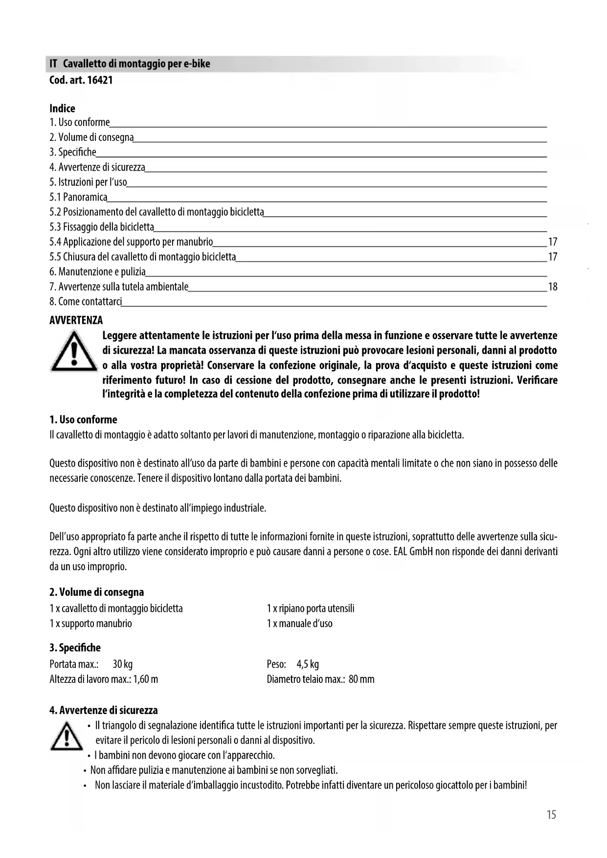 EAL GmbH Otto-Hausmann-Ring 107 42115 Wuppertal Duitsland +49 (0)202 42 92 83 0 +49 (0) 202 42 92 83 – 160 info@eal-vertrieb.com www.eal-vertrieb.com15 IT Cavalletto di montaggio per e-bike Cod. art. 16421 AVVERTENZA Leggere attentamente le istruzioni per l‘uso prima della messa in funzione e osservare tutte le avvertenze di sicurezza! La mancata osservanza di queste istruzioni può provocare lesioni personali, danni al prodotto o alla vostra proprietà! Conservare la confezione originale, la prova d‘acquisto e queste istruzioni come riferimento futuro! In caso di cessione del prodotto, consegnare anche le presenti istruzioni. Vericare l‘integrità e la completezza del contenuto della confezione prima di utilizzare il prodotto!