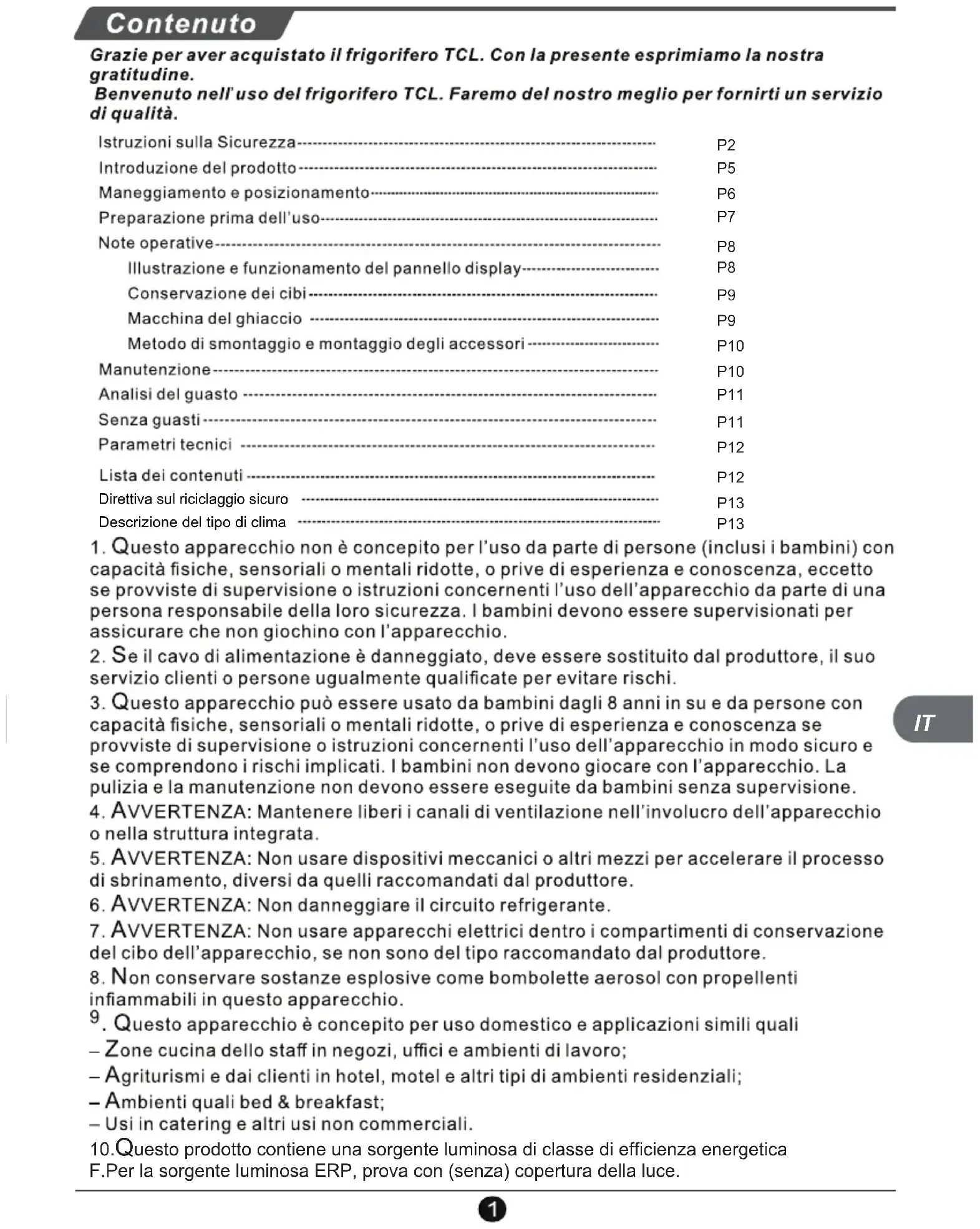 IT4 Istruzioni sulla Sicurezza Attenzioni: Il frigorifero non deve essere usato sotto la pioggia o sotto il sole. Attenzioni: È vietato porre contenitori con fluidi nel frigorifero poiché la rottura o il capovolgimento del contenitore potrebbero intaccare l’isolamento elettrico del frigorifero e causare scosse elettriche o incendi. Attenzioni: Il frigorifero non deve essere smontato o modificato senza permesso. La riparazione del frigorifero deve essere eseguita da uno specialista. Attenzioni: In caso di fuoriuscita di qualsiasi gas infiammabile come il gas di carbone, è necessario chiudere prima la valvola di sfogo e quindi aprire la finestra per la ventilazione, ed è vietato scollegare immediatamente la spina del frigorifero per evitare incendi o esplosioni causati da scintille. Attenzioni: Apparecchi refrigeranti – in particolare un frigorifero-freezer Tipo I – potrebbe non funzionare regolarmente (possibilità di scongelamento dei contenuti o temperatura che si alza troppo nel compartimento dei cibo congelato) se posto per un periodo prolungato sotto la soglia fredda del campo delle temperature per le quali è stato progettato l’apparecchio refrigerante; Attenzioni: Le bibite effervescenti non dovrebbero essere conservate nei compartimenti o negli armadi freezer o in compartimenti o armadi a bassa temperatura e alcuni prodotti come il ghiaccio non devono essere consumati troppo freddi. Attenzioni: Non bisogna eccedere i tempi di conservazione raccomandati dai produttori dei cibi per qualsiasi tipo di cibo. Attenzioni: Le precauzioni servono a prevenire un aumento indesiderato della temperatura del cibo congelato mentre si sbrina l’apparecchio refrigerante, quali avvolgere il cibo congelato in più fogli di giornale. Attenzioni: L’aumento di temperatura del cibo congelato durante lo sbrinamento manuale, la manutenzione o la pulizia potrebbe ridurre la durata della conservazione. Attenzioni: La cura è richiesta relativamente al cibo congelato e conservato in caso di non funzionamento prolungato del dispositivo refrigerante (interruzione dell’alimentazione o guasto al sistema refrigerante). Attenzioni: L’azione deve essere eseguita quando il dispositivo refrigerante è spento e fuori servizio temporaneamente o per un periodo prolungato (per es. svuotato, pulito ed asciugato, e la/le porta/e o il/i coperchio/i lasciato/i socchiuso/i). ITLe immagini sono puramente indicative. Si prega di fare riferimento all’oggetto