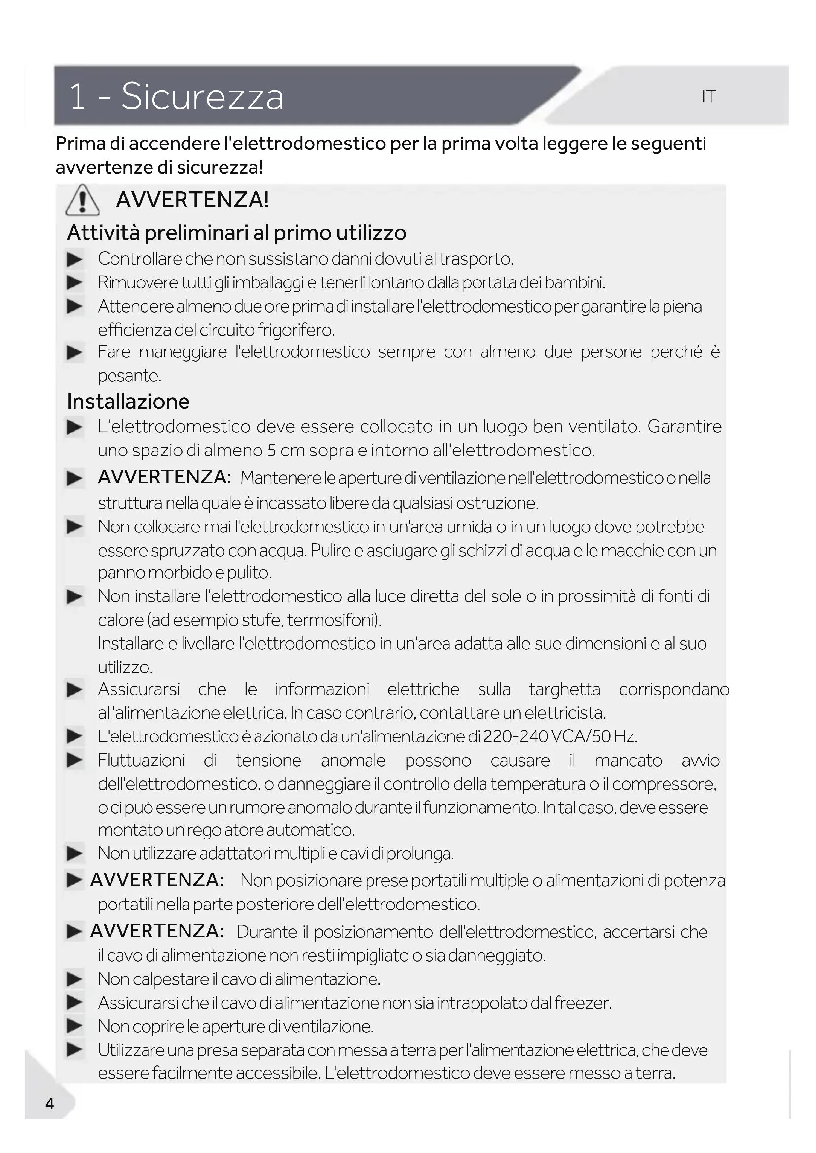 Prima di accendere l'elettrodomestico per la prima volta leggere le seguenti avvertenze di sicurezza! AVVERTENZA! Attività preliminari al primo utilizzo Controllare che non sussistano danni dovuti al trasporto. Rimuovere tutti gli imballaggi e tenerli lontano dalla portata dei bambini. Attendere almeno due ore prima di installare l'elettrodomestico per garantire la piena eƬcienza del circuito frigorifero. Fare maneggiare l'elettrodomestico sempre con almeno due persone perché è pesante. Installazione L'elettrodomestico deve essere collocato in un luogo ben ventilato. Garantire uno spazio di almeno 5 cm sopra e intorno all'elettrodomestico. AVVERTENZA: Mantenere le aperture di ventilazione nell'elettrodomestico o nella struttura nella quale è incassato libere da qualsiasi ostruzione. Non collocare mai l'elettrodomestico in un'area umida o in un luogo dove potrebbe essere spruzzato con acqua. Pulire e asciugare gli schizzi di acqua e le macchie con un panno morbido e pulito. Non installare l'elettrodomestico alla luce diretta del sole o in prossimità di fonti di calore (ad esempio stufe, termosifoni). Installare e livellare l'elettrodomestico in un'area adatta alle sue dimensioni e al suo utilizzo. Assicurarsi che le informazioni elettriche sulla targhetta corrispondano all'alimentazione elettrica. In caso contrario, contattare un elettricista. L'elettrodomestico è azionato da un'alimentazione di 220-240 VCA/50 Hz. Fluttuazioni di tensione anomale possono causare il mancato avvio dell'elettrodomestico, o danneggiare il controllo della temperatura o il compressore, o ci può essere un rumore anomalo durante il funzionamento. In tal caso, deve essere montato un regolatore automatico. Non utilizzare adattatori multipli e cavi di prolunga. AVVERTENZA: Non posizionare prese portatili multiple o alimentazioni di potenza portatili nella parte posteriore dell'elettrodomestico. AVVERTENZA: Durante il posizionamento dell'elettrodomestico, accertarsi cheil cavo di alimentazione non resti impigliato o sia danneggiato. Non calpestare il cavo di alimentazione. Assicurarsi che il cavo di alimentazione non sia intrappolato dal freezer. Non coprire le aperture di ventilazione. Utilizzare una presa separata con messa a terra per l'alimentazione elettrica, che deve essere facilmente accessibile. L'elettrodomestico deve essere messo a terra. IT5
