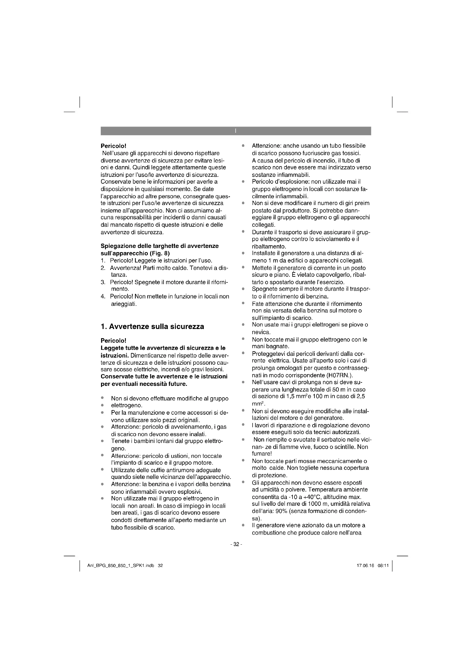 Anomalia Causa Intervento Il motore non si avvia Candela di accensione sporca Manca il carburante Pulire la candela di accensione, distanza elettrodi 0,6 mm. Rabboccare il carburante. Il generatore ha troppo poca o nessuna tensione Regolatore o condensatore difettoso È intervenuto l’interruttore di protezione contro le sovracorrenti Filtro dell’aria sporco Rivolgersi ad un rivenditore specializzato. Azionare l’interruttore e diminuire gli utenti. Pulire o sostituire il fi ltro. Anl_BPG_850_850_1_SPK1.indb 37Anl_BPG_850_850_1_SPK1.indb 37 17.06.16 08:1117.06.16 08:11I