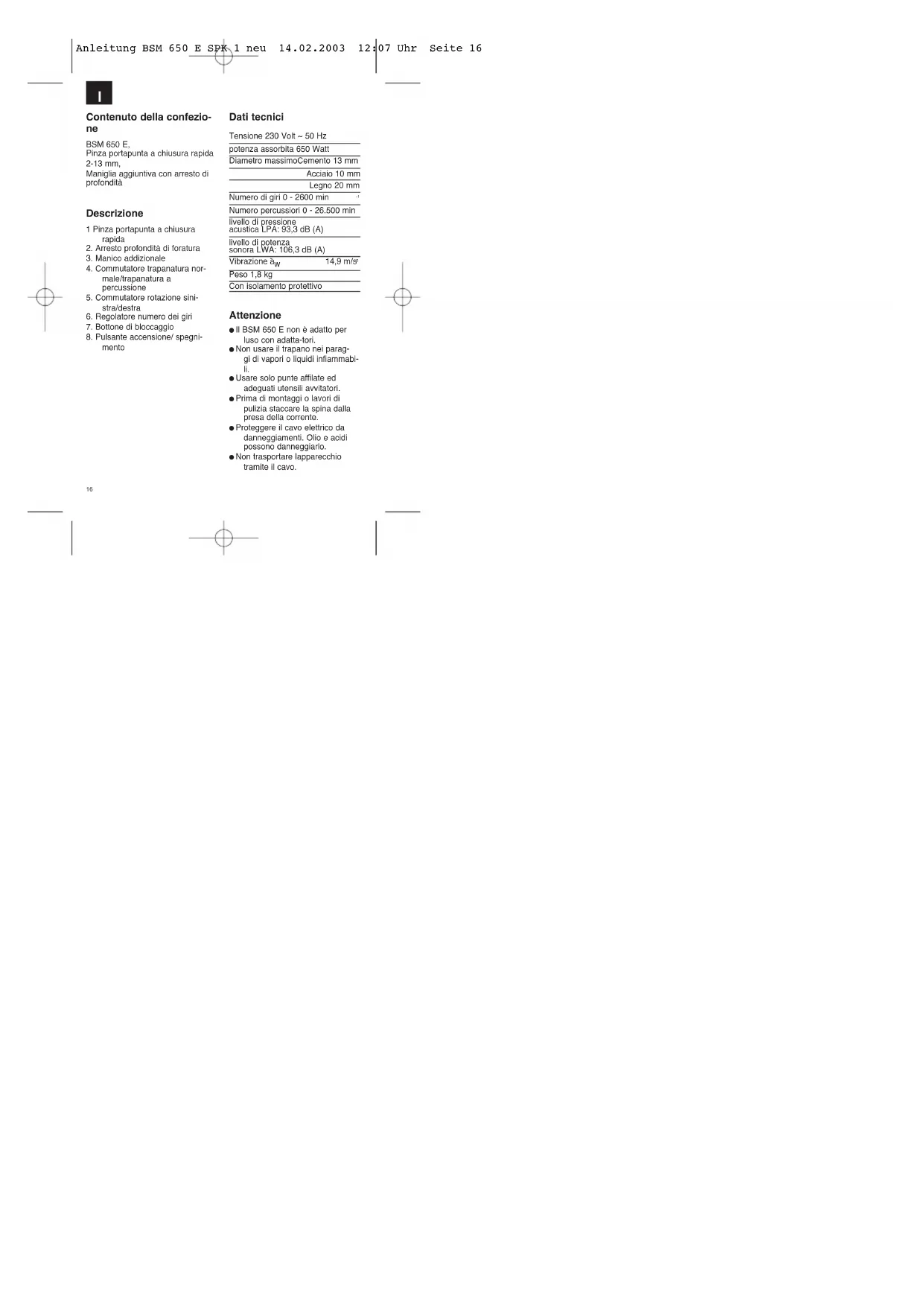 Peso 1,8 kg Con isolamento protettivo Attenzione Il BSM 650 E non è adatto per luso con adatta-tori. Non usare il trapano nei parag- gi di vapori o liquidi infiammabi- li. Usare solo punte affilate ed adeguati utensili avvitatori. Prima di montaggi o lavori di pulizia staccare la spina dalla presa della corrente. Proteggere il cavo elettrico da danneggiamenti. Olio e acidi possono danneggiarlo. Non trasportare lapparecchio tramite il cavo. Anleitung BSM 650 E SPK 1 neu 14.02.2003 12:07 Uhr Seite 16I