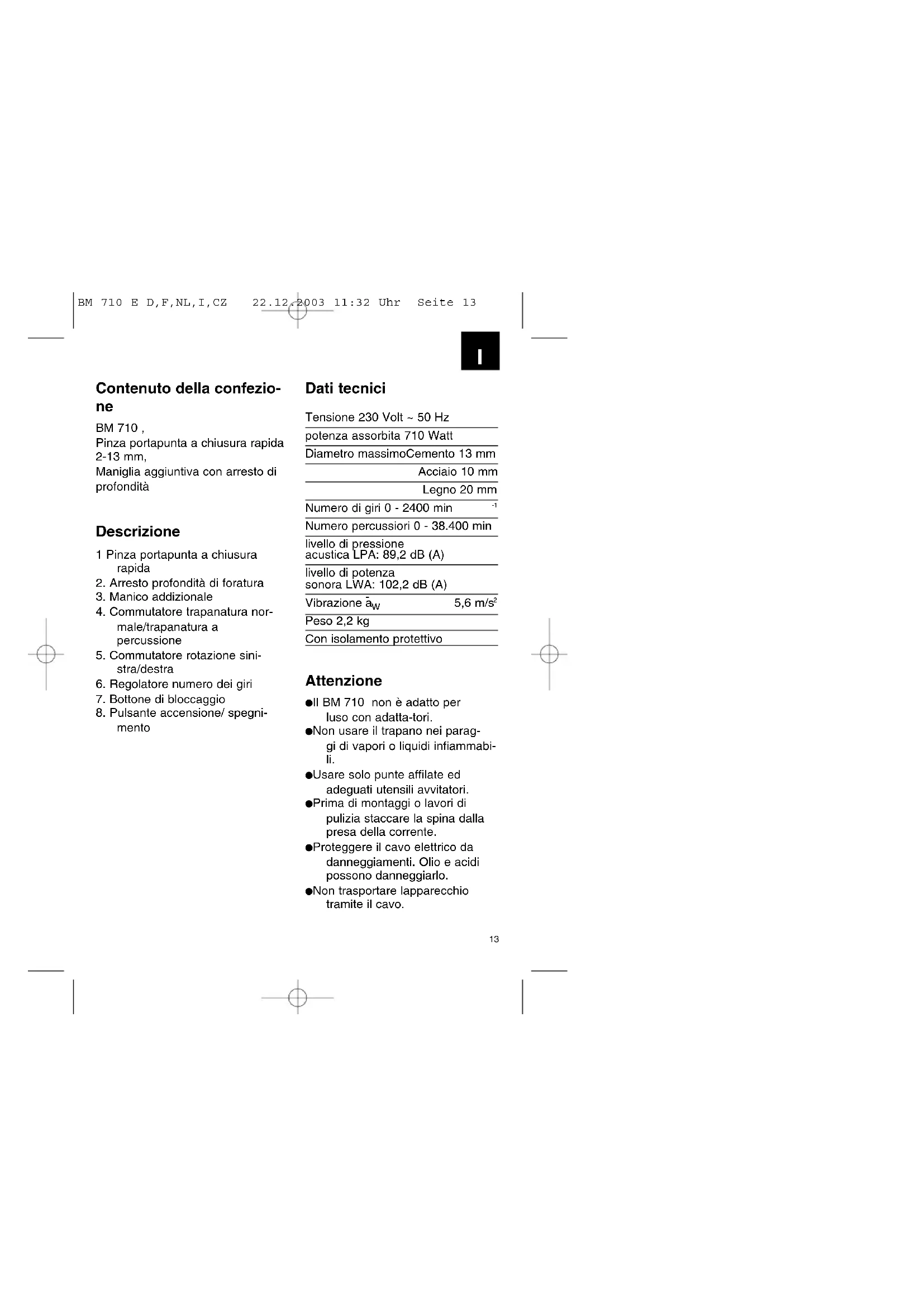 Peso 2,2 kg Con isolamento protettivo Attenzione Il BM 710 non è adatto per luso con adatta-tori. Non usare il trapano nei parag- gi di vapori o liquidi infiammabi- li. Usare solo punte affilate ed adeguati utensili avvitatori. Prima di montaggi o lavori di pulizia staccare la spina dalla presa della corrente. Proteggere il cavo elettrico da danneggiamenti. Olio e acidi possono danneggiarlo. Non trasportare lapparecchio tramite il cavo. BM 710 E D,F,NL,I,CZ 22.12.2003 11:32 Uhr Seite 13I