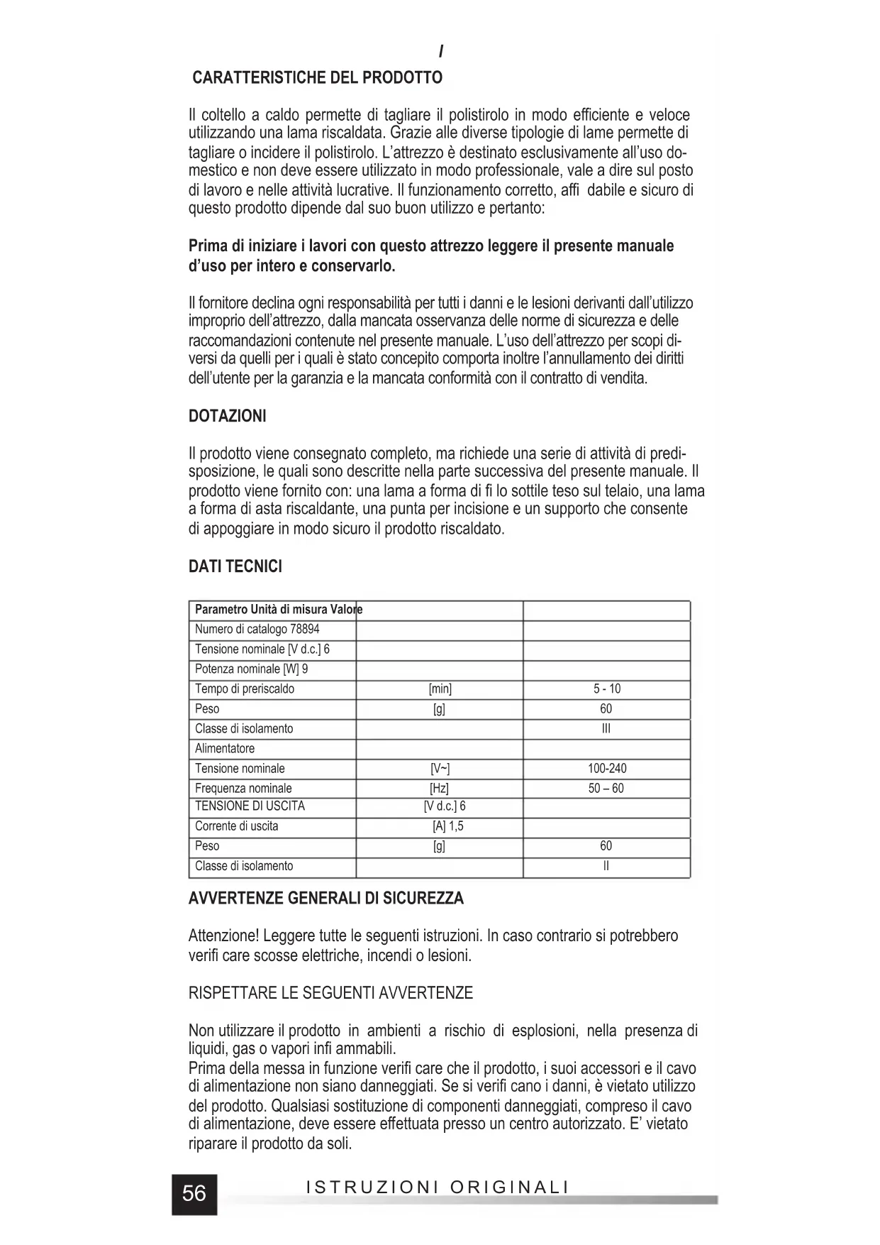 Il coltello a caldo permette di tagliare il polistirolo in modo effi ciente e veloce utilizzando una lama riscaldata. Grazie alle diverse tipologie di lame permette di tagliare o incidere il polistirolo. L’attrezzo è destinato esclusivamente all’uso do- mestico e non deve essere utilizzato in modo professionale, vale a dire sul posto di lavoro e nelle attività lucrative. Il funzionamento corretto, affi dabile e sicuro di questo prodotto dipende dal suo buon utilizzo e pertanto: Prima di iniziare i lavori con questo attrezzo leggere il presente manuale d’uso per intero e conservarlo. Il fornitore declina ogni responsabilità per tutti i danni e le lesioni derivanti dall’utilizzo improprio dell’attrezzo, dalla mancata osservanza delle norme di sicurezza e delle raccomandazioni contenute nel presente manuale. L’uso dell’attrezzo per scopi di- versi da quelli per i quali è stato concepito comporta inoltre l’annullamento dei diritti dell’utente per la garanzia e la mancata conformità con il contratto di vendita. DOTAZIONI Il prodotto viene consegnato completo, ma richiede una serie di attività di predi- sposizione, le quali sono descritte nella parte successiva del presente manuale. Il prodotto viene fornito con: una lama a forma di fi lo sottile teso sul telaio, una lama a forma di asta riscaldante, una punta per incisione e un supporto che consente di appoggiare in modo sicuro il prodotto riscaldato. DATI TECNICI Parametro Unità di misura Valore Numero di catalogo 78894 Tensione nominale [V d.c.] 6 Potenza nominale [W] 9 Tempo di preriscaldo [min] 5 - 10 Peso [g] 60 Classe di isolamento III Alimentatore Tensione nominale [V~] 100-240 Frequenza nominale [Hz] 50 – 60 TENSIONE DI USCITA [V d.c.] 6 Corrente di uscita [A] 1,5 Peso [g] 60 Classe di isolamento II