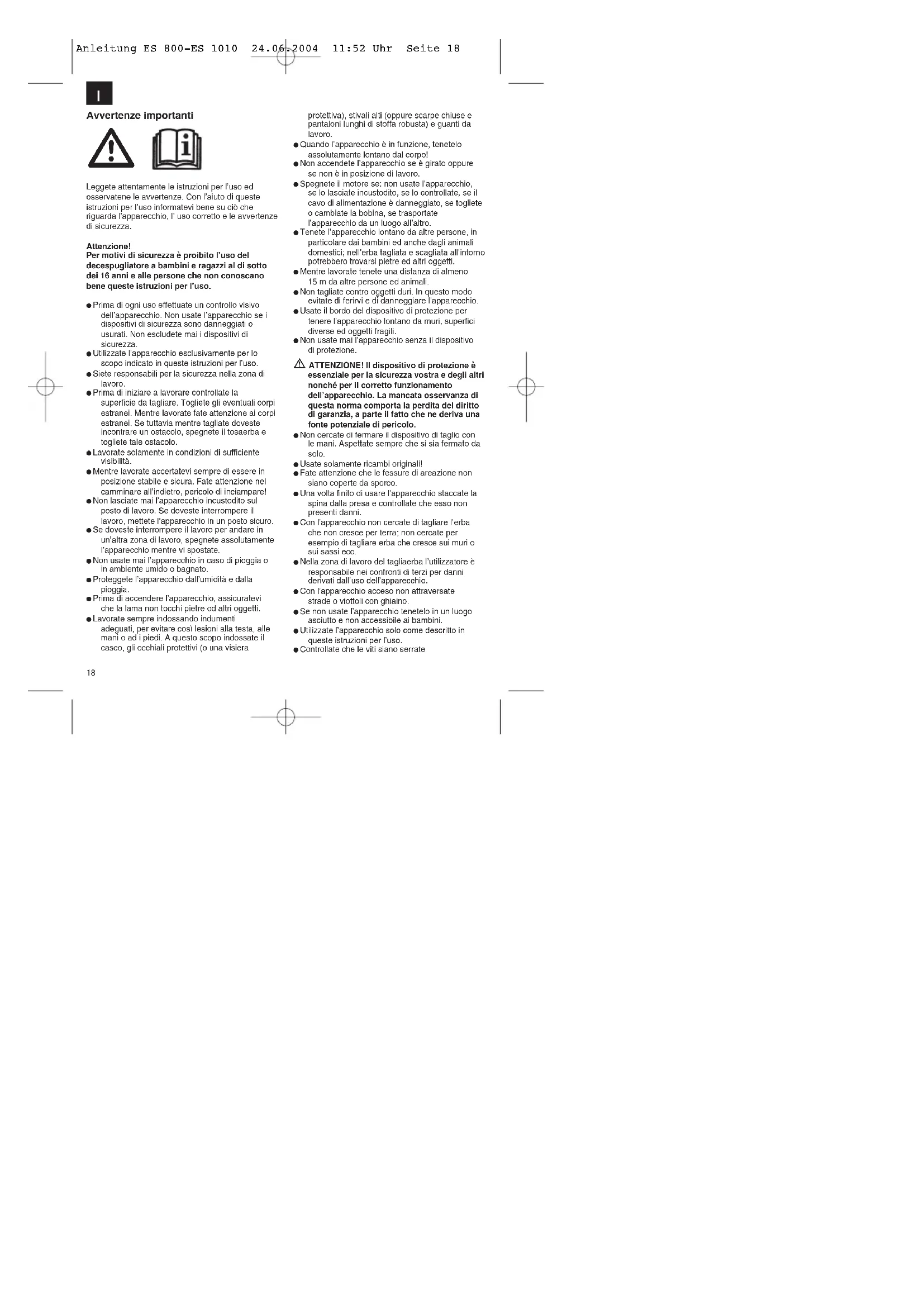 Anleitung ES 800-ES 1010 24.06.2004 11:52 Uhr Seite 2011. Manutenzione e cura Prima di pulire e mettere via il decespugliatore elettrico spegnerlo e staccare la spina dalla presa di corrente. Togliere con una spazzola i depositi sulla calotta protettiva. Pulire il corpo e le parti in plastica con un leggero detergente domestico ed un panno umido. Per la pulizia non usate mezzi aggressivi o solventi. Non lavare mai il decespugliatore con un getto d’acqua o con un’idropulitrice. Evitate assolutamente che l’acqua penetri all’interno dell’apparecchio.