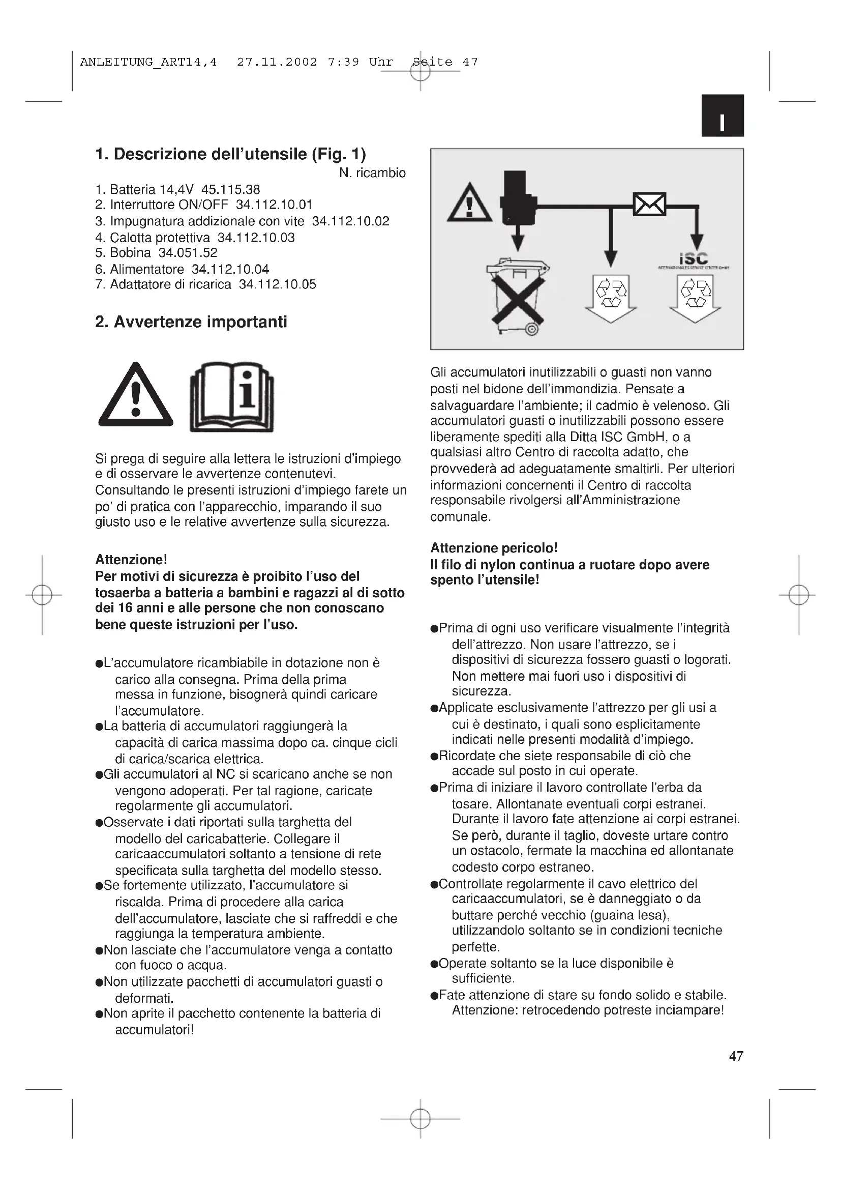 ANLEITUNG_ART14,4 27.11.2002 7:39 Uhr Seite 4647 1. Descrizione dell’utensile (Fig. 1)N. ricambio1. Batteria 14,4V 45.115.382. Interruttore ON/OFF 34.112.10.013. Impugnatura addizionale con vite 34.112.10.024. Calotta protettiva 34.112.10.035. Bobina 34.051.526. Alimentatore 34.112.10.047. Adattatore di ricarica 34.112.10.052. Avvertenze importanti Si prega di seguire alla lettera le istruzioni d’impiegoe di osservare le avvertenze contenutevi.Consultando le presenti istruzioni d’impiego farete unpo’ di pratica con l’apparecchio, imparando il suogiusto uso e le relative avvertenze sulla sicurezza.Attenzione!Per motivi di sicurezza è proibito l’uso deltosaerba a batteria a bambini e ragazzi al di sottodei 16 anni e alle persone che non conoscanobene queste istruzioni per l’uso. L’accumulatore ricambiabile in dotazione non è carico alla consegna. Prima della prima messa in funzione, bisognerà quindi caricare l’accumulatore. La batteria di accumulatori raggiungerà la capacità di carica massima dopo ca. cinque cicli di carica/scarica elettrica. Gli accumulatori al NC si scaricano anche se nonvengono adoperati. Per tal ragione, caricate regolarmente gli accumulatori. Osservate i dati riportati sulla targhetta del modello del caricabatterie. Collegare il caricaaccumulatori soltanto a tensione di rete specificata sulla targhetta del modello stesso. Se fortemente utilizzato, l’accumulatore si riscalda. Prima di procedere alla carica dell’accumulatore, lasciate che si raffreddi e che raggiunga la temperatura ambiente. Non lasciate che l’accumulatore venga a contattocon fuoco o acqua. Non utilizzate pacchetti di accumulatori guasti o deformati. Non aprite il pacchetto contenente la batteria di accumulatori!Gli accumulatori inutilizzabili o guasti non vannoposti nel bidone dell’immondizia. Pensate asalvaguardare l’ambiente; il cadmio è velenoso. Gliaccumulatori guasti o inutilizzabili possono essereliberamente spediti alla Ditta ISC GmbH, o aqualsiasi altro Centro di raccolta adatto, cheprovvederà ad adeguatamente smaltirli. Per ulterioriinformazioni concernenti il Centro di raccoltaresponsabile rivolgersi all’Amministrazionecomunale.Attenzione pericolo!Il filo di nylon continua a ruotare dopo averespento l’utensile! Prima di ogni uso verificare visualmente l’integritàdell’attrezzo. Non usare l’attrezzo, se i dispositivi di sicurezza fossero guasti o logorati. Non mettere mai fuori uso i dispositivi di sicurezza. Applicate esclusivamente l’attrezzo per gli usi a cui è destinato, i quali sono esplicitamente indicati nelle presenti modalità d’impiego. Ricordate che siete responsabile di ciò che accade sul posto in cui operate. Prima di iniziare il lavoro controllate l’erba da tosare. Allontanate eventuali corpi estranei. Durante il lavoro fate attenzione ai corpi estranei.Se però, durante il taglio, doveste urtare contro un ostacolo, fermate la macchina ed allontanate codesto corpo estraneo. Controllate regolarmente il cavo elettrico del caricaaccumulatori, se è danneggiato o da buttare perché vecchio (guaina lesa), utilizzandolo soltanto se in condizioni tecniche perfette. Operate soltanto se la luce disponibile è sufficiente. Fate attenzione di stare su fondo solido e stabile.Attenzione: retrocedendo potreste inciampare!