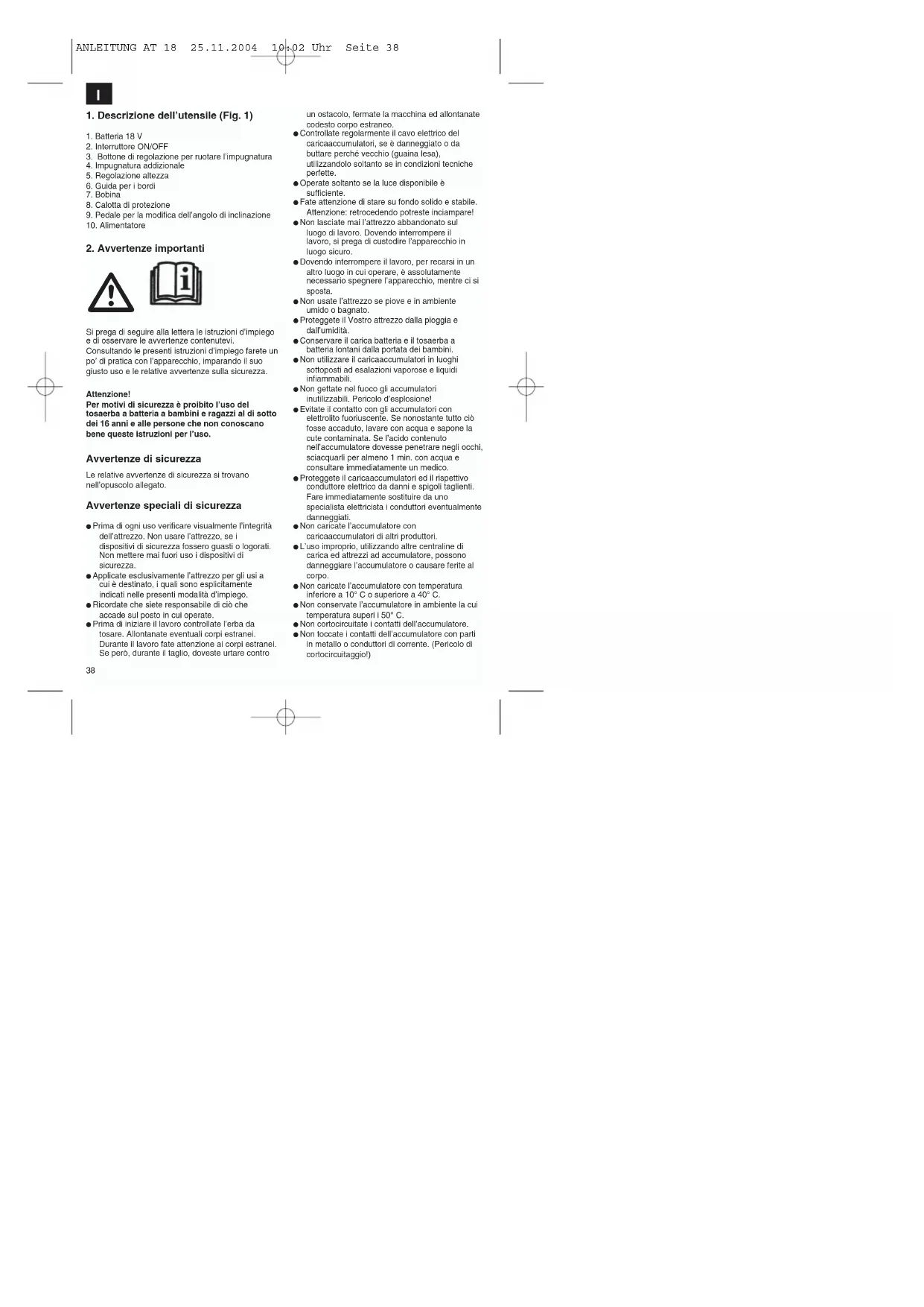Si prega di seguire alla lettera le istruzioni d’impiego e di osservare le avvertenze contenutevi. Consultando le presenti istruzioni d’impiego farete un po’ di pratica con l’apparecchio, imparando il suo giusto uso e le relative avvertenze sulla sicurezza. Attenzione! Per motivi di sicurezza è proibito l’uso del tosaerba a batteria a bambini e ragazzi al di sotto dei 16 anni e alle persone che non conoscano bene queste istruzioni per l’uso. Avvertenze di sicurezza Le relative avvertenze di sicurezza si trovano nell’opuscolo allegato. Avvertenze speciali di sicurezza Prima di ogni uso verificare visualmente l’integrità dell’attrezzo. Non usare l’attrezzo, se i dispositivi di sicurezza fossero guasti o logorati. Non mettere mai fuori uso i dispositivi di sicurezza. Applicate esclusivamente l’attrezzo per gli usi a cui è destinato, i quali sono esplicitamente indicati nelle presenti modalità d’impiego. Ricordate che siete responsabile di ciò che accade sul posto in cui operate. Prima di iniziare il lavoro controllate l’erba da tosare. Allontanate eventuali corpi estranei. Durante il lavoro fate attenzione ai corpi estranei. Se però, durante il taglio, doveste urtare contro un ostacolo, fermate la macchina ed allontanate codesto corpo estraneo. Controllate regolarmente il cavo elettrico del caricaaccumulatori, se è danneggiato o da buttare perché vecchio (guaina lesa), utilizzandolo soltanto se in condizioni tecniche perfette. Operate soltanto se la luce disponibile è sufficiente. Fate attenzione di stare su fondo solido e stabile. Attenzione: retrocedendo potreste inciampare! Non lasciate mai l’attrezzo abbandonato sul luogo di lavoro. Dovendo interrompere il lavoro, si prega di custodire l’apparecchio in luogo sicuro. Dovendo interrompere il lavoro, per recarsi in un altro luogo in cui operare, è assolutamente necessario spegnere l’apparecchio, mentre ci si sposta. Non usate l’attrezzo se piove e in ambiente umido o bagnato. Proteggete il Vostro attrezzo dalla pioggia e dall’umidità. Conservare il carica batteria e il tosaerba a batteria lontani dalla portata dei bambini. Non utilizzare il caricaaccumulatori in luoghi sottoposti ad esalazioni vaporose e liquidi infiammabili. Non gettate nel fuoco gli accumulatori inutilizzabili. Pericolo d’esplosione! Evitate il contatto con gli accumulatori con elettrolito fuoriuscente. Se nonostante tutto ciò fosse accaduto, lavare con acqua e sapone la cute contaminata. Se l’acido contenuto nell’accumulatore dovesse penetrare negli occhi, sciacquarli per almeno 1 min. con acqua e consultare immediatamente un medico. Proteggete il caricaaccumulatori ed il rispettivo conduttore elettrico da danni e spigoli taglienti. Fare immediatamente sostituire da uno specialista elettricista i conduttori eventualmente danneggiati. Non caricate l’accumulatore con caricaaccumulatori di altri produttori. L’uso improprio, utilizzando altre centraline di carica ed attrezzi ad accumulatore, possono danneggiare l’accumulatore o causare ferite al corpo. Non caricate l’accumulatore con temperatura inferiore a 10° C o superiore a 40° C. Non conservate l’accumulatore in ambiente la cui temperatura superi i 50° C. Non cortocircuitate i contatti dell’accumulatore. Non toccate i contatti dell’accumulatore con parti in metallo o conduttori di corrente. (Pericolo di cortocircuitaggio!) ANLEITUNG AT 18 25.11.2004 10:02 Uhr Seite 38I