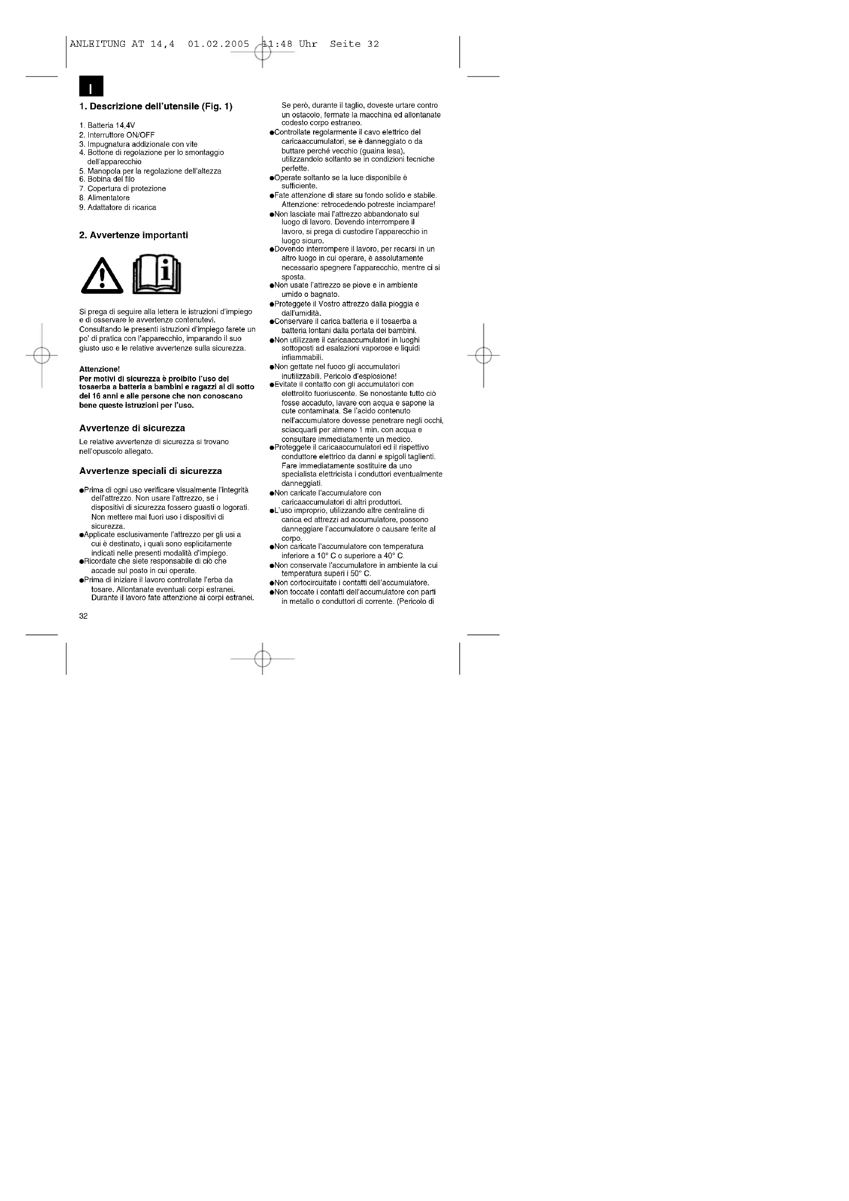 Si prega di seguire alla lettera le istruzioni d’impiego e di osservare le avvertenze contenutevi. Consultando le presenti istruzioni d’impiego farete un po’ di pratica con l’apparecchio, imparando il suo giusto uso e le relative avvertenze sulla sicurezza. Attenzione! Per motivi di sicurezza è proibito l’uso del tosaerba a batteria a bambini e ragazzi al di sotto dei 16 anni e alle persone che non conoscano bene queste istruzioni per l’uso. Avvertenze di sicurezza Le relative avvertenze di sicurezza si trovano nell’opuscolo allegato. Avvertenze speciali di sicurezza Prima di ogni uso verificare visualmente l’integrità dell’attrezzo. Non usare l’attrezzo, se i dispositivi di sicurezza fossero guasti o logorati. Non mettere mai fuori uso i dispositivi di sicurezza. Applicate esclusivamente l’attrezzo per gli usi a cui è destinato, i quali sono esplicitamente indicati nelle presenti modalità d’impiego. Ricordate che siete responsabile di ciò che accade sul posto in cui operate. Prima di iniziare il lavoro controllate l’erba da tosare. Allontanate eventuali corpi estranei. Durante il lavoro fate attenzione ai corpi estranei. Se però, durante il taglio, doveste urtare contro un ostacolo, fermate la macchina ed allontanate codesto corpo estraneo. Controllate regolarmente il cavo elettrico del caricaaccumulatori, se è danneggiato o da buttare perché vecchio (guaina lesa), utilizzandolo soltanto se in condizioni tecniche perfette. Operate soltanto se la luce disponibile è sufficiente. Fate attenzione di stare su fondo solido e stabile. Attenzione: retrocedendo potreste inciampare! Non lasciate mai l’attrezzo abbandonato sul luogo di lavoro. Dovendo interrompere il lavoro, si prega di custodire l’apparecchio in luogo sicuro. Dovendo interrompere il lavoro, per recarsi in un altro luogo in cui operare, è assolutamente necessario spegnere l’apparecchio, mentre ci si sposta. Non usate l’attrezzo se piove e in ambiente umido o bagnato. Proteggete il Vostro attrezzo dalla pioggia e dall’umidità. Conservare il carica batteria e il tosaerba a batteria lontani dalla portata dei bambini. Non utilizzare il caricaaccumulatori in luoghi sottoposti ad esalazioni vaporose e liquidi infiammabili. Non gettate nel fuoco gli accumulatori inutilizzabili. Pericolo d’esplosione! Evitate il contatto con gli accumulatori con elettrolito fuoriuscente. Se nonostante tutto ciò fosse accaduto, lavare con acqua e sapone la cute contaminata. Se l’acido contenuto nell’accumulatore dovesse penetrare negli occhi, sciacquarli per almeno 1 min. con acqua e consultare immediatamente un medico. Proteggete il caricaaccumulatori ed il rispettivo conduttore elettrico da danni e spigoli taglienti. Fare immediatamente sostituire da uno specialista elettricista i conduttori eventualmente danneggiati. Non caricate l’accumulatore con caricaaccumulatori di altri produttori. L’uso improprio, utilizzando altre centraline di carica ed attrezzi ad accumulatore, possono danneggiare l’accumulatore o causare ferite al corpo. Non caricate l’accumulatore con temperatura inferiore a 10° C o superiore a 40° C. Non conservate l’accumulatore in ambiente la cui temperatura superi i 50° C. Non cortocircuitate i contatti dell’accumulatore. Non toccate i contatti dell’accumulatore con parti in metallo o conduttori di corrente. (Pericolo di ANLEITUNG AT 14,4 01.02.2005 11:48 Uhr Seite 32I