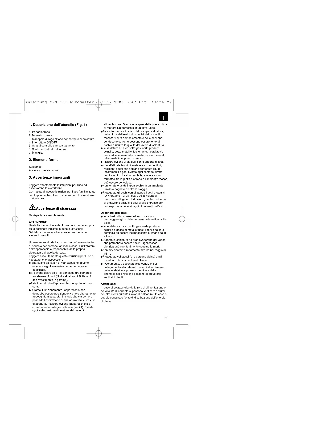 Anleitung CEN 151 Euromaster 15.12.2003 8:47 Uhr Seite 27Fonti di pericolo durante la saldatura ad arco Durante la saldatura ad arco si presentano diverse fonti di pericolo. Quindi è particolarmente importante per il saldatore rispettare le seguenti regole per non mettere in pericolo se stesso e gli altri e per evitare danni a persone e apparecchi.