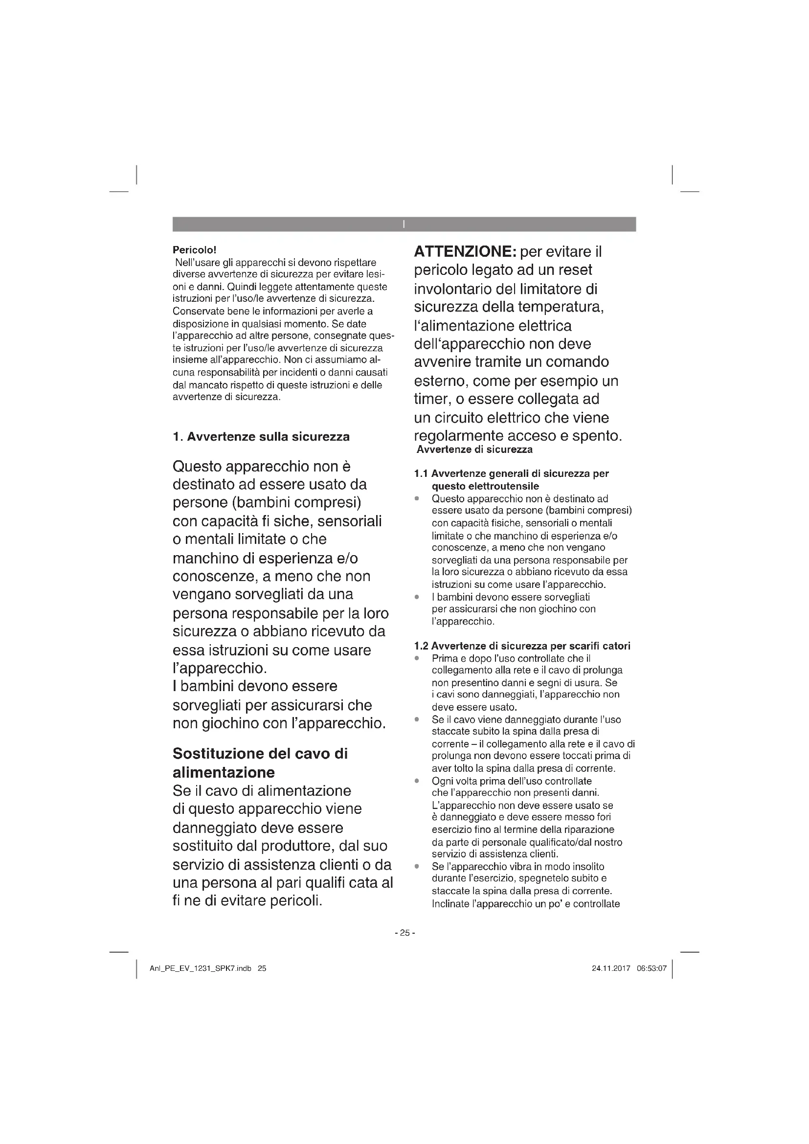 Questo apparecchio non è destinato ad essere usato da persone (bambini compresi) con capacità fi siche, sensoriali o mentali limitate o che manchino di esperienza e/o conoscenze, a meno che non vengano sorvegliati da una persona responsabile per la loro sicurezza o abbiano ricevuto da essa istruzioni su come usare l’apparecchio. I bambini devono essere sorvegliati per assicurarsi che non giochino con l’apparecchio. Sostituzione del cavo di alimentazione Se il cavo di alimentazione di questo apparecchio viene danneggiato deve essere sostituito dal produttore, dal suo servizio di assistenza clienti o da una persona al pari qualifi cata al fi ne di evitare pericoli. ATTENZIONE: per evitare il pericolo legato ad un reset involontario del limitatore di sicurezza della temperatura, l‘alimentazione elettrica dell‘apparecchio non deve avvenire tramite un comando esterno, come per esempio un timer, o essere collegata ad un circuito elettrico che viene regolarmente acceso e spento. Avvertenze di sicurezza