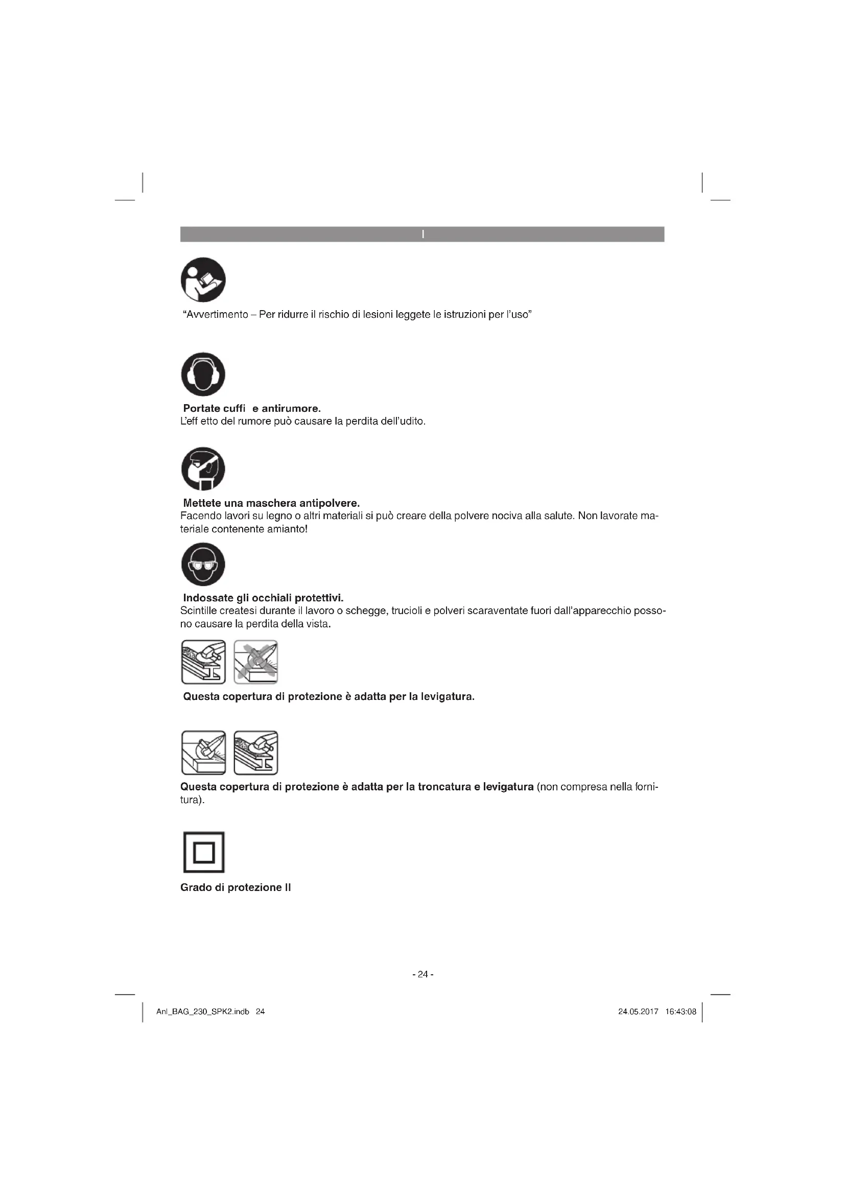 “Avvertimento – Per ridurre il rischio di lesioni leggete le istruzioni per l’uso” Portate cuffi e antirumore. L’ e ff etto del rumore può causare la perdita dell’udito. Indossate gli occhiali protettivi. Scintille createsi durante il lavoro o schegge, trucioli e polveri scaraventate fuori dall’apparecchio posso- no causare la perdita della vista. Mettete una maschera antipolvere. Facendo lavori su legno o altri materiali si può creare della polvere nociva alla salute. Non lavorate ma- teriale contenente amianto! Questa copertura di protezione è adatta per la troncatura e levigatura (non compresa nella forni- tura). Questa copertura di protezione è adatta per la levigatura. Grado di protezione II Anl_BAG_230_SPK2.indb 24Anl_BAG_230_SPK2.indb 24 24.05.2017 16:43:0824.05.2017 16:43:08I