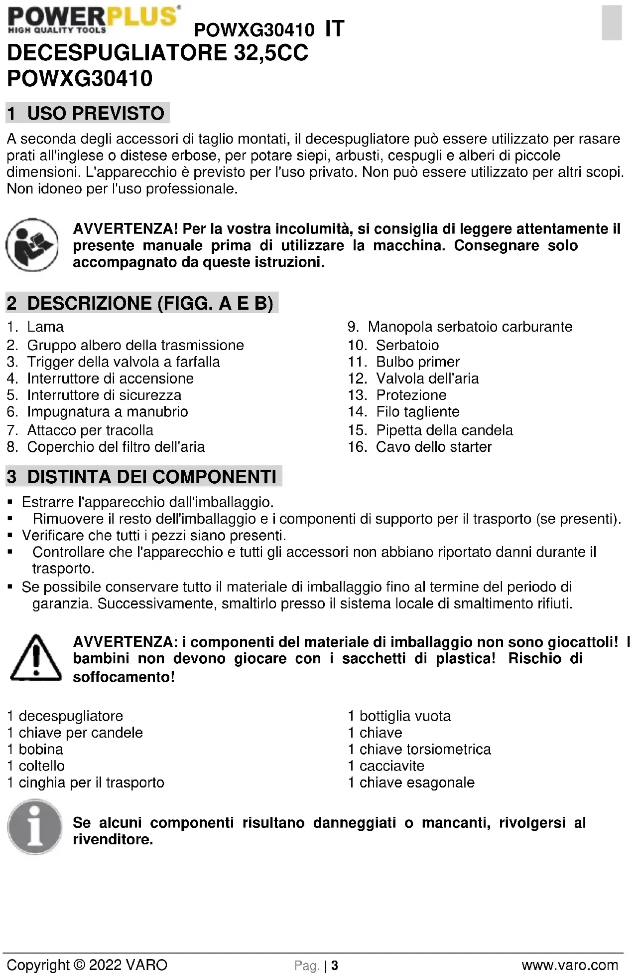 Copyright © 2022 VARO Pag. | 3 www.varo.com DECESPUGLIATORE 32,5CC POWXG30410 1 USO PREVISTO A seconda degli accessori di taglio montati, il decespugliatore può essere utilizzato per rasare prati all'inglese o distese erbose, per potare siepi, arbusti, cespugli e alberi di piccole dimensioni. L'apparecchio è previsto per l'uso privato. Non può essere utilizzato per altri scopi. Non idoneo per l'uso professionale. AVVERTENZA! Per la vostra incolumità, si consiglia di leggere attentamente il presente manuale prima di utilizzare la macchina. Consegnare solo accompagnato da queste istruzioni. 2 DESCRIZIONE (FIGG. A E B)