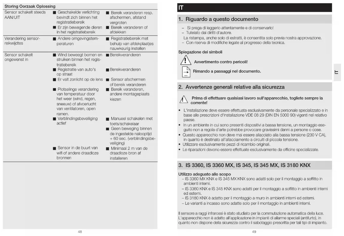 - In un ambiente in cui sono presenti dispositivi a bassa tensione, un montaggio ese- guito non a regola d'arte potrebbe provocare gravissimi danni a persone o cose.• Questo apparecchio non deve mai essere allacciato alla bassa tensione (230 V CA), in quanto è destinato all'allacciamento a circuiti di piccola tensione.• Utilizzare esclusivamente pezzi di ricambio originali.• Le riparazioni devono essere eettuate esclusivamente da ocine specializzate. 3 IS3360, IS3360 MX, IS345, IS 345 MX, IS3180 KNX Utilizzo adeguato allo scopo – IS3360MXKNX e IS345MXKNX sono adatti solo per il montaggio a sotto in ambienti interni. – IS3360KNX e IS345KNX sono adatti per il montaggio a sotto in ambienti interni ed esterni. – IS3180KNX è adatto per il montaggio a muro in ambienti interni ed esterni. – Le varianti a incasso sono adatte solo per il montaggio in ambienti interni.Il sensore a raggi infrarossi è stato studiato per la commutazione automatica della luce. L'apparecchio non è adatto all'applicazione in impianti di allarme speciali (antifurto), in quanto non dispone della sicurezza contro il sabotaggio prescritta per tali tipi di impianto.