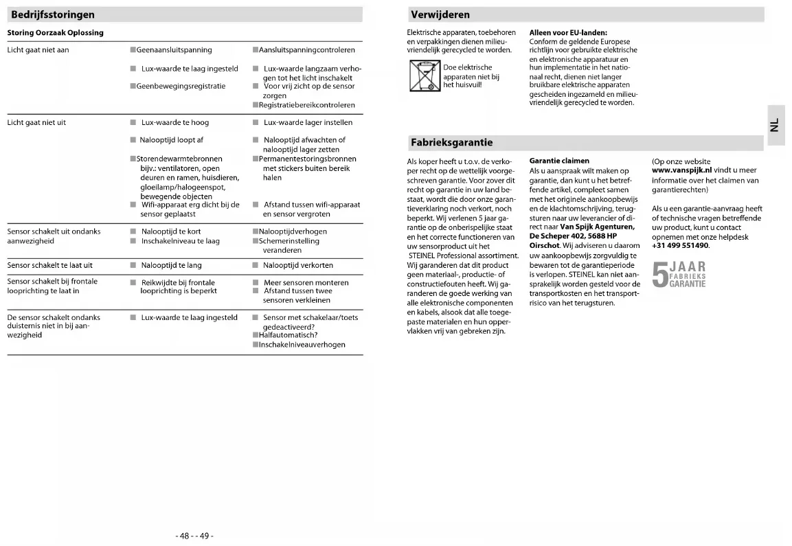 Valore della luminosità di base Tramite la pressione dei relativi ta- sti, > 5 s, il valore di luminosità cambia in passi del 10% passando a: 1 = 10%, 2 = 20%, ... 6 = 60% Dimmerazione tramite pressione del tasto Quando il tasto è collegato al mor- setto S, è possibile dimmerare la luce premendo il tasto stesso. Il ta- sto si porta dapprima al valore massimo per poi tornare al valore minimo. Se si rilascia il tasto, il rela- tivo valore viene mantenuto fino allo spegnimento senza ulteriore regolazione. Dopo di ciò il rilevatore ritorna alla modalità sensore precedentemen- te impostata. È possibile modificare la direzione della dimmerazione (max./min.) ri- lasciando brevemente e poi ripre- mendo il tasto.- 58 - - 59 - Garanzia del produttore Quale acquirente Lei può rivendi-care nei confronti del venditore i diritti previsti dalla legge. Nella misura in cui tali diritti esistono nel Suo paese, la nostra dichiara-zione di garanzia né li riduce né li limita. Noi Le concediamo 5 anni di garanzia dell’impeccabile costi-tuzione e del regolare funziona-mento del Suo prodotto a sensori STEINEL Professional. Noi garan-tiamo che questo prodotto è pri-vo di difetti di produzione e co-struzione. Garantiamo la funzio-nalità di tutti i componenti elet-tronici e di tutti i cavi nonché l’assenza di vizi di tutti i materiali impiegati e delle loro superfici.RivendicazioneSe ha intenzione di esporre recla-mo in merito al prodotto da Lei acquistato, La si prega di trasmet-tere tale reclamo completo e affrancato assieme allo scontrino d’acquisto o alla fattura indicante la data dell’acquisto e la denomi-nazione del prodotto al Suo ri-venditore o direttamente a noi: STEINEL Italia S.r.l., Largo Donegani 2, I-20121 Milano. Le consigliamo pertanto di con-servare scrupolosamente lo scon-trino d’acquisto o la fattura fino alla scadenza del periodo di ga-ranzia. La STEINEL declina ogni responsabilità per costi e rischi legati al trasporto nell’ambito della restituzione del prodotto.(Per informazioni in merito alla rivendicazione di un diritto di garanzia si prega di consultare il nostro sito web www.steinel.it)Se dovesse esporre un caso di garanzia o una domanda sul Suo prodotto, ci può contattare al numero +39/02/96457231 dal lunedì al venerdì dalle 9:00 alle 18:00. Disturbi di funzionamento Guasto Causa RimedioLa luce non si accendeL mancanza di tensione di allacciamentoL valore Lux impostato troppo bassoL non viene rilevato nessun movimentoL controllare la tensione di allacciamentoL aumentare lentamente il valore Lux finché la luce non si accendeL fare in modo da liberare la visuale sul sensoreL verificare il campo di rilevamentoLa luce non si spegneL valore Lux troppo elevato L il tempo di attesa sta scadendoL interferenza da parte difonti di calore, per es.: termoventi-latore, porte o finestre aper-te, animali domestici, lampa-dina/spot alogeno, oggetti in movimentoL dispositivo WiFi posizionato molto vicino al sensoreL abbassare il valore LuxL aspettare la scadenza del tempo di attesa o all'occorrenza ridurloL escludere fonti d'interferenza stazionarie mediante adesiviL aumentare la distanza tra dispositivo WiFi e sensoreIl sensore provoca lo spegni- mento delle luci nonostante la presenza di personeL il tempo di attesa è troppo breveL la soglia luminosa è troppo bassaL aumentare il tempo di attesaL modificare la regolazione crepuscolareIl sensore spegne le luci troppo tardiL il tempo di attesa è eccessivamente lungoL ridurre il tempo di attesaIn caso di senso di marcia frontale il sensore accende le luci troppo tardiL il raggio d'azione per il senso di marcia frontale è ridottoL montare ulteriori sensoriL ridurre la distanza tra due sensoriIl sensore non accende le luci in presenza di persone nonostante sia buioL valore Lux scelto troppo bassoL è stato disattivato il sensore con l'interruttore/il tasto?L funzionamento semiauto- matico?L aumentare la soglia di luminosità