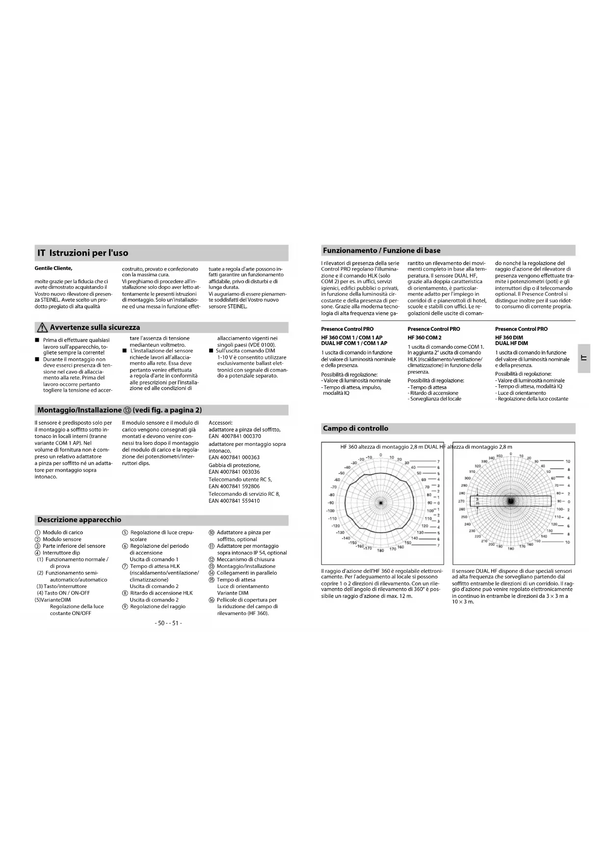 L Prima di effettuare qualsiasi lavoro sull'apparecchio, to- gliete sempre la corrente! L Durante il montaggio non deve esserci presenza di ten- sione nel cavo di allaccia- mento alla rete. Prima del lavoro occorre pertanto togliere la tensione ed accer- tare l'assenza di tensione medianteun voltmetro. L L'installazione del sensore richiede lavori all'allaccia- mento alla rete. Essa deve pertanto venire effettuata a regola d'arte in conformità alle prescrizioni per l'installa- zione ed alle condizioni di allacciamento vigenti nei singoli paesi (VDE 0100). L Sull'uscita comando DIM 1-10 V è consentito utilizzare esclusivamente ballast elet- tronici con segnale di coman- do a potenziale separato. Descrizione apparecchio a Modulo di carico b Modulo sensore c Parte inferiore del sensore d Interruttore dip (1) Funzionamento normale / di prova (2) Funzionamento semi- automatico/automatico (3) Tasto/interruttore (4) Tasto ON / ON-OFF (5) Variante DIM Regolazione della luce costante ON/OFF e Regolazione di luce crepu- scolare f Regolazione del periodo di accensione Uscita di comando 1 g Tempo di attesa HLK (riscaldamento/ventilazione/ climatizzazione) Uscita di comando 2 h Ritardo di accensione HLK Uscita di comando 2 i Regolazione del raggio j Adattatore a pinza per soffitto, optional k Adattatore per montaggio sopra intonaco IP 54, optional l Meccanismo di chiusura m Montaggio/Installazione n Collegamenti in parallelo o Tempo di attesa Luce di orientamento Variante DIM p Pellicole di copertura per la riduzione del campo di rilevamento (HF 360). Montaggio/Installazione m (vedi fig. a pagina 2) Il sensore è predisposto solo per il montaggio a soffitto sotto in- tonaco in locali interni (tranne variante COM 1 AP). Nel volume di fornitura non è com- preso un relativo adattatore a pinza per soffitto né un adatta- tore per montaggio sopra intonaco. Il modulo sensore e il modulo di carico vengono consegnati già montati e devono venire con- nessi tra loro dopo il montaggio del modulo di carico e la regola- zione dei potenziometri/inter- ruttori dips. Accessori: adattatore a pinza del soffitto, EAN 4007841 000370 adattatore per montaggio sopra intonaco, EAN 4007841 000363 Gabbia di protezione, EAN 4007841 003036 Telecomando utente RC 5, EAN 4007841 592806 Telecomando di servizio RC 8, EAN 4007841 559410 IT Istruzioni per l'uso Gentile Cliente, molte grazie per la fiducia che ci avete dimostrato acquistando il Vostro nuovo rilevatore di presen- za STEINEL. Avete scelto un pro- dotto pregiato di alta qualità costruito, provato e confezionato con la massima cura. Vi preghiamo di procedere all'in- stallazione solo dopo aver letto at- tentamente le presenti istruzioni di montaggio. Solo un'installazio- ne ed una messa in funzione effet- tuate a regola d'arte possono in- fatti garantire un funzionamento affidabile, privo di disturbi e di lunga durata. Vi auguriamo di essere pienamen- te soddisfatti del Vostro nuovo sensore STEINEL. Avvertenze sulla sicurezza Funzionamento / Funzione di base I rilevatori di presenza della serie Control PRO regolano l'illumina- zione e il comando HLK (solo COM 2) per es. in uffici, servizi igienici, edifici pubblici o privati, in funzione della luminosità cir- costante e della presenza di per- sone. Grazie alla moderna tecno- logia di alta frequenza viene ga- rantito un rilevamento dei movi- menti completo in base alla tem- peratura. Il sensore DUAL HF, grazie alla doppia caratteristica di orientamento, è particolar- mente adatto per l'impiego in corridoi di e pianerottoli di hotel, scuole e stabili con uffici. Le re- golazioni delle uscite di coman- do nonché la regolazione del raggio d'azione del rilevatore di presenza vengono effettuate tra- mite i potenziometri (poti) e gli interruttori dip o il telecomando optional. Il Presence Control si distingue inoltre per il suo ridot- to consumo di corrente propria. Presence Control PRO