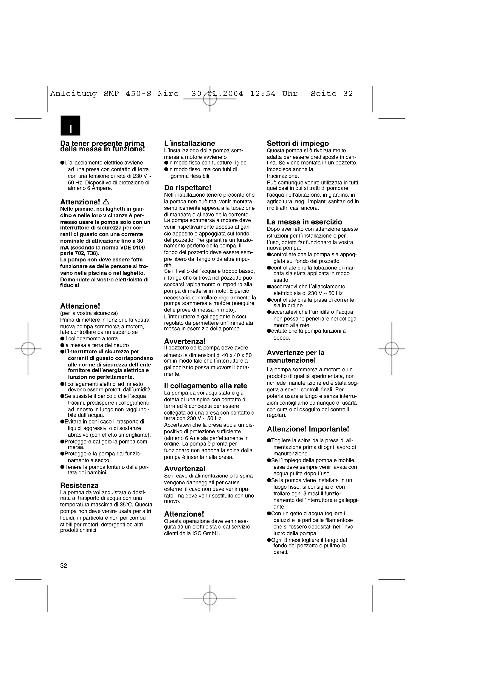 - ¤Ó· ÛÒÌ·Ù· ̤¯ÚÈ ø 25 mm À„Ô˜ ¤Ó·Ú͢ ÏÂÈÙÔ˘ÚÁ›·˜ (ON): 50 cm À„Ô˜ ¤Ó·Ú͢ ÏÂÈÙÔ˘ÚÁ›·˜ (OFF): 5 cm ∞ÚÈıÌfi˜ ÚÔÈfiÓÙÔ˜: 41.703.30 ∆¯ÓÈο ‰Â‰Ô̤ӷ ™ÙÔȯ›· ·fi‰ÔÛ˘ À„Ô˜ ÔÚÒıËÛ˘ ¶ÔÛfiÙËÙ· SMP 450/1-S NIRO 1m ̤Á.: 8.000 l/h 2m ̤Á.: 6.600 l/h 3m ̤Á.: 5.400 l/h 4m ̤Á.: 4.000 l/h 5m ̤Á.: 2.700 l/h 6m ̤Á.: 1.200 l/h Anleitung SMP 450-S Niro 30.01.2004 12:54 Uhr Seite 3132 Da tener presente prima della messa in funzione! ● L´allacciamento elettrico avvienead una presa con contatto di terracon una tensione di rete di 230 V ~50 Hz. Dispositivo di protezione dialmeno 6 Ampere. Attenzione! Nelle piscine, nei laghetti in giar-dino e nelle loro vicinanze è per-messo usare la pompa solo con uninterruttore di sicurezza per cor-renti di guasto con una correntenominale di attivazione fino a 30mA (secondo la norma VDE 0100parte 702, 738).La pompa non deve essere fattafunzionare se delle persone si tro-vano nella piscina o nel laghetto.Domandate al vostro elettricista difiducia! Attenzione! (per la vostra sicurezza)Prima di mettere in funzione la vostranuova pompa sommersa a motore,fate controllare da un esperto se● il collegamento a terra● la messa a terra del neutro● l´interruttore di sicurezza percorrenti di guasto corrispondanoalle norme di sicurezza dell´entefornitore dell´energia elettrica efunzionino perfettamente.● I collegamenti elettrici ad innestodevono essere protetti dall´umidità.● Se sussiste il pericolo che l´acquatracimi, predisporre i collegamentiad innesto in luogo non raggiungi-bile dall´acqua.● Evitare in ogni caso il trasporto diliquidi aggressivi o di sostanzeabrasive (con effetto smerigliante).● Proteggere dal gelo la pompa som-mersa.● Proteggere la pompa dal funzio-namento a secco.● Tenere la pompa lontano dalla por-tata dei bambini. Resistenza La pompa da voi acquistata è desti-nata al trasporto di acqua con unatemperatura massima di 35°C. Questapompa non deve venire usata per altriliquidi, in particolare non per combu-stibili per motori, detergenti ed altriprodotti chimici! Settori di impiego Questa pompa si è rivelata moltoadatta per essere predisposta in can-tina. Se viene montata in un pozzetto,impedisce anche la tracimazione.Può comunque venire utilizzata in tuttiquei casi in cui si tratti di pomparel’acqua nell’abitazione, in giardino, inagricoltura, negli impianti sanitari ed inmolti altri casi ancora. La messa in esercizio Dopo aver letto con attenzione questeistruzioni per l´installazione e perl´uso, potete far funzionare la vostranuova pompa:● controllate che la pompa sia appog-giata sul fondo del pozzetto● controllate che la tubazione di man-data sia stata applicata in modoesatto● accertatevi che l´allacciamentoelettrico sia di 230 V ~ 50 Hz● controllate che la presa di correntesia in ordine● accertatevi che l´umidità o l´acquanon possano penetrare nel collega-mento alla rete● evitate che la pompa funzioni asecco. Avvertenze per la manutenzione! La pompa sommersa a motore è unprodotto di qualità sperimentata, nonrichiede manutenzione ed è stata sog-getta a severi controlli finali. Perpoterla usare a lungo e senza interru-zioni consigliamo comunque di usarlacon cura e di eseguire dei controlliregolari. Attenzione! Importante! ● Togliere la spina dalla presa di ali-mentazione prima di ogni lavoro dimanutenzione.● Se l´impiego della pompa è mobile,essa deve sempre venir lavata conacqua pulita dopo l´uso.● Se la pompa viene installata in unluogo fisso, si consiglia di con-trollare ogni 3 mesi il funzio-namento dell´interruttore a galleggi-ante.● Con un getto d´acqua togliere ipeluzzi e le particelle filamentoseche si fossero depositati nell´invo-lucro della pompa.● Ogni 3 mesi togliere il fango dalfondo del pozzetto e pulirne lepareti. L´installazione L´installazione della pompa som-mersa a motore avviene o● in modo fisso con tubature rigide● in modo fisso, ma con tubi digomma flessibili Da rispettare! Nell´installazione tenere presente chela pompa non può mai venir montatasemplicemente appesa alla tubazionedi mandata o al cavo della corrente.La pompa sommersa a motore devevenir rispettivamente appesa al gan-cio apposito o appoggiata sul fondodel pozzetto. Per garantire un funzio-namento perfetto della pompa, ilfondo del pozzetto deve essere sem-pre libero dal fango o da altre impu-rità.Se il livello dell´acqua è troppo basso,il fango che si trova nel pozzetto puòseccarsi rapidamente e impedire allapompa di mettersi in moto. È perciònecessario controllare regolarmente lapompa sommersa a motore (eseguiredelle prove di messa in moto).L´interruttore a galleggiante è cosìregolato da permettere un´immediatamessa in esercizio della pompa. Avvertenza! Il pozzetto della pompa deve averealmeno le dimensioni di 40 x 40 x 50cm in modo tale che l´interruttore agalleggiante possa muoversi libera-mente. Il collegamento alla rete La pompa da voi acquistata è giàdotata di una spina con contatto diterra ed è concepita per essere collegata ad una presa con contatto diterra con 230 V ~ 50 Hz. Accertatevi che la presa abbia un dis-positivo di protezione sufficiente(almeno 6 A) e sia perfettamente inordine. La pompa è pronta per funzionare non appena la spina dellapompa è inserita nella presa. Avvertenza! Se il cavo di alimentazione o la spinavengono danneggiati per causeesterne, il cavo non deve venir ripa-rato, ma deve venir sostituito con unonuovo. Attenzione! Questa operazione deve venir ese-guita da un elettricista o dal servizioclienti della ISC GmbH.