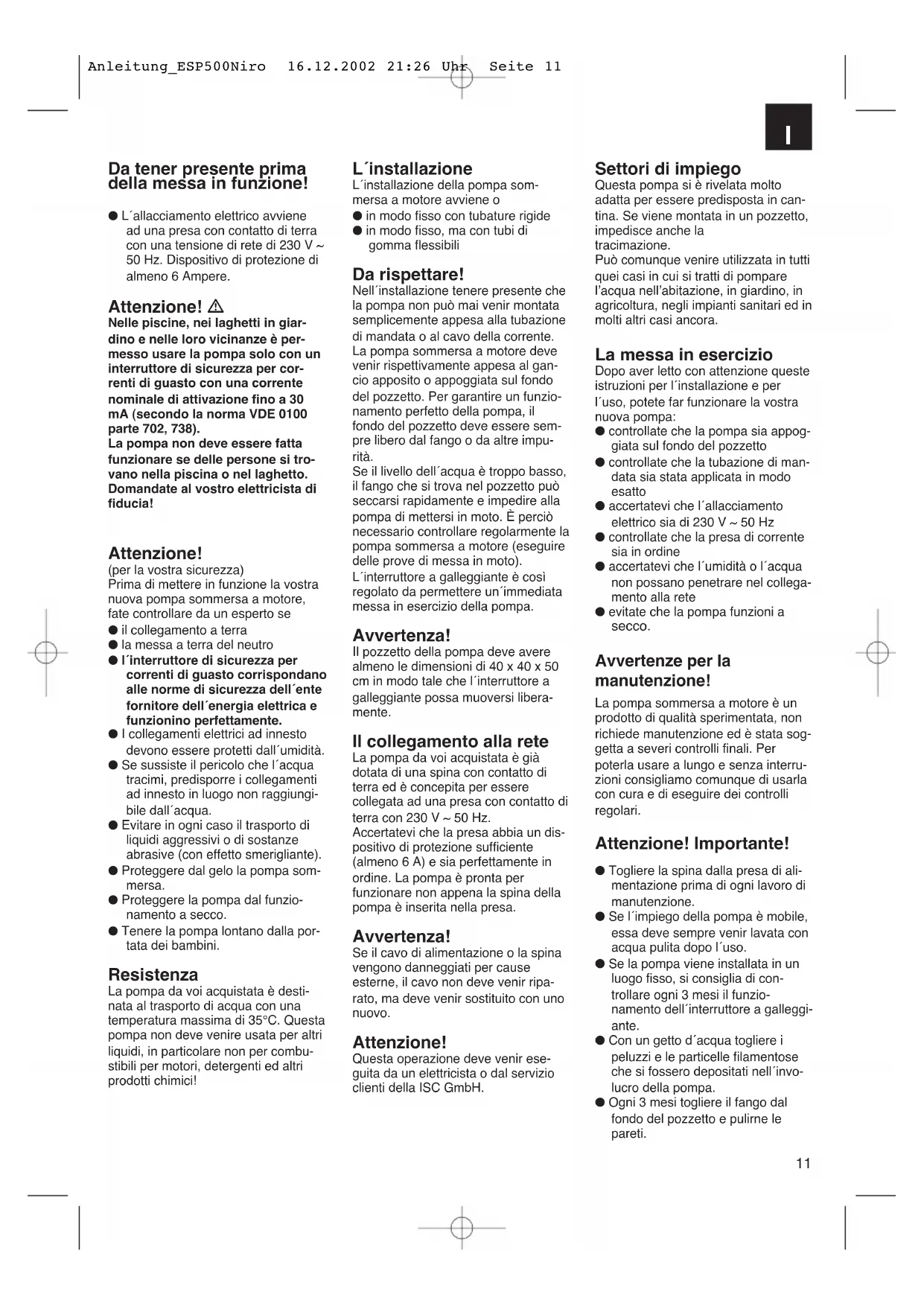 Netaansluiting 230 V ~ 50 Hz Opgenomen vermogen 500 Watt Capaciteit max. 17.500 l/h Opvoerhoogte max. 7,5 m Dompeldiepte max. 5 m Watertemperatuur max. 35° C Slangaansluiting 1 1/2” buitendraad Vreemde voorwerpen tot Ø 18 mm Schakelpunthoogte: AAN 50 cm Schakelpunthoogte: UIT 5 cm Artikelnr. : 41.705.11 Technische gegevens Vermogensgegevens Opvoerhoogte Wateropbrengst ESP 500 NIRO 1m max.: 16.500 l/h 2m max.: 15.600 l/h 3m max.: 14.400 l/h 4m max.: 12.900 l/h 5m max.: 11.100 l/h 6m max.: 19.000 l/h Anleitung_ESP500Niro 16.12.2002 21:26 Uhr Seite 1011 Da tener presente prima della messa in funzione! ● L´allacciamento elettrico avvienead una presa con contatto di terracon una tensione di rete di 230 V ~50 Hz. Dispositivo di protezione dialmeno 6 Ampere. Attenzione! Nelle piscine, nei laghetti in giar-dino e nelle loro vicinanze è per-messo usare la pompa solo con uninterruttore di sicurezza per cor-renti di guasto con una correntenominale di attivazione fino a 30mA (secondo la norma VDE 0100parte 702, 738).La pompa non deve essere fattafunzionare se delle persone si tro-vano nella piscina o nel laghetto.Domandate al vostro elettricista difiducia! Attenzione! (per la vostra sicurezza)Prima di mettere in funzione la vostranuova pompa sommersa a motore,fate controllare da un esperto se● il collegamento a terra● la messa a terra del neutro● l´interruttore di sicurezza percorrenti di guasto corrispondanoalle norme di sicurezza dell´entefornitore dell´energia elettrica efunzionino perfettamente.● I collegamenti elettrici ad innestodevono essere protetti dall´umidità.● Se sussiste il pericolo che l´acquatracimi, predisporre i collegamentiad innesto in luogo non raggiungi-bile dall´acqua.● Evitare in ogni caso il trasporto diliquidi aggressivi o di sostanzeabrasive (con effetto smerigliante).● Proteggere dal gelo la pompa som-mersa.● Proteggere la pompa dal funzio-namento a secco.● Tenere la pompa lontano dalla por-tata dei bambini. Resistenza La pompa da voi acquistata è desti-nata al trasporto di acqua con unatemperatura massima di 35°C. Questapompa non deve venire usata per altriliquidi, in particolare non per combu-stibili per motori, detergenti ed altriprodotti chimici! Settori di impiego Questa pompa si è rivelata moltoadatta per essere predisposta in can-tina. Se viene montata in un pozzetto,impedisce anche la tracimazione.Può comunque venire utilizzata in tuttiquei casi in cui si tratti di pomparel’acqua nell’abitazione, in giardino, inagricoltura, negli impianti sanitari ed inmolti altri casi ancora. La messa in esercizio Dopo aver letto con attenzione questeistruzioni per l´installazione e perl´uso, potete far funzionare la vostranuova pompa:● controllate che la pompa sia appog-giata sul fondo del pozzetto● controllate che la tubazione di man-data sia stata applicata in modoesatto● accertatevi che l´allacciamentoelettrico sia di 230 V ~ 50 Hz● controllate che la presa di correntesia in ordine● accertatevi che l´umidità o l´acquanon possano penetrare nel collega-mento alla rete● evitate che la pompa funzioni a secco. Avvertenze per la manutenzione! La pompa sommersa a motore è unprodotto di qualità sperimentata, nonrichiede manutenzione ed è stata sog-getta a severi controlli finali. Perpoterla usare a lungo e senza interru-zioni consigliamo comunque di usarlacon cura e di eseguire dei controlliregolari. Attenzione! Importante! ● Togliere la spina dalla presa di ali-mentazione prima di ogni lavoro dimanutenzione.● Se l´impiego della pompa è mobile,essa deve sempre venir lavata conacqua pulita dopo l´uso.● Se la pompa viene installata in unluogo fisso, si consiglia di con-trollare ogni 3 mesi il funzio-namento dell´interruttore a galleggi-ante.● Con un getto d´acqua togliere ipeluzzi e le particelle filamentoseche si fossero depositati nell´invo-lucro della pompa.● Ogni 3 mesi togliere il fango dalfondo del pozzetto e pulirne lepareti. L´installazione L´installazione della pompa som-mersa a motore avviene o● in modo fisso con tubature rigide● in modo fisso, ma con tubi digomma flessibili Da rispettare! Nell´installazione tenere presente chela pompa non può mai venir montatasemplicemente appesa alla tubazionedi mandata o al cavo della corrente.La pompa sommersa a motore devevenir rispettivamente appesa al gan-cio apposito o appoggiata sul fondodel pozzetto. Per garantire un funzio-namento perfetto della pompa, ilfondo del pozzetto deve essere sem-pre libero dal fango o da altre impu-rità.Se il livello dell´acqua è troppo basso,il fango che si trova nel pozzetto puòseccarsi rapidamente e impedire allapompa di mettersi in moto. È perciònecessario controllare regolarmente lapompa sommersa a motore (eseguiredelle prove di messa in moto).L´interruttore a galleggiante è cosìregolato da permettere un´immediatamessa in esercizio della pompa. Avvertenza! Il pozzetto della pompa deve avere almeno le dimensioni di 40 x 40 x 50cm in modo tale che l´interruttore agalleggiante possa muoversi libera-mente. Il collegamento alla rete La pompa da voi acquistata è giàdotata di una spina con contatto diterra ed è concepita per essere collegata ad una presa con contatto diterra con 230 V ~ 50 Hz. Accertatevi che la presa abbia un dis-positivo di protezione sufficiente(almeno 6 A) e sia perfettamente inordine. La pompa è pronta per funzionare non appena la spina dellapompa è inserita nella presa. Avvertenza! Se il cavo di alimentazione o la spinavengono danneggiati per causeesterne, il cavo non deve venir ripa-rato, ma deve venir sostituito con unonuovo. Attenzione! Questa operazione deve venir ese-guita da un elettricista o dal servizioclienti della ISC GmbH.