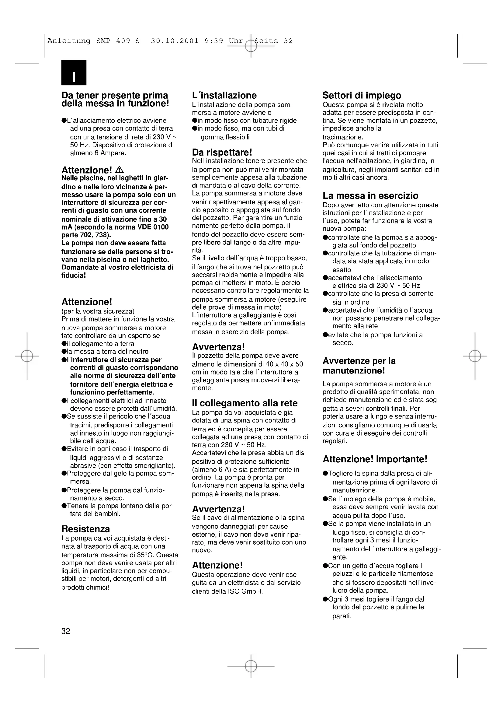 - ¤Ó· ÛÒÌ·Ù· ̤¯ÚÈ ø 20 mm À„Ô˜ ¤Ó·Ú͢ ÏÂÈÙÔ˘ÚÁ›·˜ (ON): 50 cm À„Ô˜ ¤Ó·Ú͢ ÏÂÈÙÔ˘ÚÁ›·˜ (OFF): 5 cm ∞ÚÈıÌfi˜ ÚÔÈfiÓÙÔ˜: 41.705.40 ∆¯ÓÈο ‰Â‰Ô̤ӷ ™ÙÔȯ›· ·fi‰ÔÛ˘ À„Ô˜ ÔÚÒıËÛ˘ ¶ÔÛfiÙËÙ· SMP 409-S 2m ̤Á.: 7.000 l/h 3m ̤Á.: 5.500 l/h 4m ̤Á.: 3.000 l/h Anleitung SMP 409-S 30.10.2001 9:39 Uhr Seite 3132 Da tener presente prima della messa in funzione! ● L´allacciamento elettrico avvienead una presa con contatto di terracon una tensione di rete di 230 V ~50 Hz. Dispositivo di protezione dialmeno 6 Ampere. Attenzione! Nelle piscine, nei laghetti in giar-dino e nelle loro vicinanze è per-messo usare la pompa solo con uninterruttore di sicurezza per cor-renti di guasto con una correntenominale di attivazione fino a 30mA (secondo la norma VDE 0100parte 702, 738).La pompa non deve essere fattafunzionare se delle persone si tro-vano nella piscina o nel laghetto.Domandate al vostro elettricista difiducia! Attenzione! (per la vostra sicurezza)Prima di mettere in funzione la vostranuova pompa sommersa a motore,fate controllare da un esperto se● il collegamento a terra● la messa a terra del neutro● l´interruttore di sicurezza percorrenti di guasto corrispondanoalle norme di sicurezza dell´entefornitore dell´energia elettrica efunzionino perfettamente.● I collegamenti elettrici ad innestodevono essere protetti dall´umidità.● Se sussiste il pericolo che l´acquatracimi, predisporre i collegamentiad innesto in luogo non raggiungi-bile dall´acqua.● Evitare in ogni caso il trasporto diliquidi aggressivi o di sostanzeabrasive (con effetto smerigliante).● Proteggere dal gelo la pompa som-mersa.● Proteggere la pompa dal funzio-namento a secco.● Tenere la pompa lontano dalla por-tata dei bambini. Resistenza La pompa da voi acquistata è desti-nata al trasporto di acqua con unatemperatura massima di 35°C. Questapompa non deve venire usata per altriliquidi, in particolare non per combu-stibili per motori, detergenti ed altriprodotti chimici! Settori di impiego Questa pompa si è rivelata moltoadatta per essere predisposta in can-tina. Se viene montata in un pozzetto,impedisce anche la tracimazione.Può comunque venire utilizzata in tuttiquei casi in cui si tratti di pomparel’acqua nell’abitazione, in giardino, inagricoltura, negli impianti sanitari ed inmolti altri casi ancora. La messa in esercizio Dopo aver letto con attenzione questeistruzioni per l´installazione e perl´uso, potete far funzionare la vostranuova pompa:● controllate che la pompa sia appog-giata sul fondo del pozzetto● controllate che la tubazione di man-data sia stata applicata in modoesatto● accertatevi che l´allacciamentoelettrico sia di 230 V ~ 50 Hz● controllate che la presa di correntesia in ordine● accertatevi che l´umidità o l´acquanon possano penetrare nel collega-mento alla rete● evitate che la pompa funzioni a secco. Avvertenze per la manutenzione! La pompa sommersa a motore è unprodotto di qualità sperimentata, nonrichiede manutenzione ed è stata sog-getta a severi controlli finali. Perpoterla usare a lungo e senza interru-zioni consigliamo comunque di usarlacon cura e di eseguire dei controlliregolari. Attenzione! Importante! ● Togliere la spina dalla presa di ali-mentazione prima di ogni lavoro dimanutenzione.● Se l´impiego della pompa è mobile,essa deve sempre venir lavata conacqua pulita dopo l´uso.● Se la pompa viene installata in unluogo fisso, si consiglia di con-trollare ogni 3 mesi il funzio-namento dell´interruttore a galleggi-ante.● Con un getto d´acqua togliere ipeluzzi e le particelle filamentoseche si fossero depositati nell´invo-lucro della pompa.● Ogni 3 mesi togliere il fango dalfondo del pozzetto e pulirne lepareti. L´installazione L´installazione della pompa som-mersa a motore avviene o● in modo fisso con tubature rigide● in modo fisso, ma con tubi digomma flessibili Da rispettare! Nell´installazione tenere presente chela pompa non può mai venir montatasemplicemente appesa alla tubazionedi mandata o al cavo della corrente.La pompa sommersa a motore devevenir rispettivamente appesa al gan-cio apposito o appoggiata sul fondodel pozzetto. Per garantire un funzio-namento perfetto della pompa, ilfondo del pozzetto deve essere sem-pre libero dal fango o da altre impu-rità.Se il livello dell´acqua è troppo basso,il fango che si trova nel pozzetto puòseccarsi rapidamente e impedire allapompa di mettersi in moto. È perciònecessario controllare regolarmente lapompa sommersa a motore (eseguiredelle prove di messa in moto).L´interruttore a galleggiante è cosìregolato da permettere un´immediatamessa in esercizio della pompa. Avvertenza! Il pozzetto della pompa deve avere almeno le dimensioni di 40 x 40 x 50cm in modo tale che l´interruttore agalleggiante possa muoversi libera-mente. Il collegamento alla rete La pompa da voi acquistata è giàdotata di una spina con contatto diterra ed è concepita per essere collegata ad una presa con contatto diterra con 230 V ~ 50 Hz. Accertatevi che la presa abbia un dis-positivo di protezione sufficiente(almeno 6 A) e sia perfettamente inordine. La pompa è pronta per funzionare non appena la spina dellapompa è inserita nella presa. Avvertenza! Se il cavo di alimentazione o la spinavengono danneggiati per causeesterne, il cavo non deve venir ripa-rato, ma deve venir sostituito con unonuovo. Attenzione! Questa operazione deve venir ese-guita da un elettricista o dal servizioclienti della ISC GmbH.