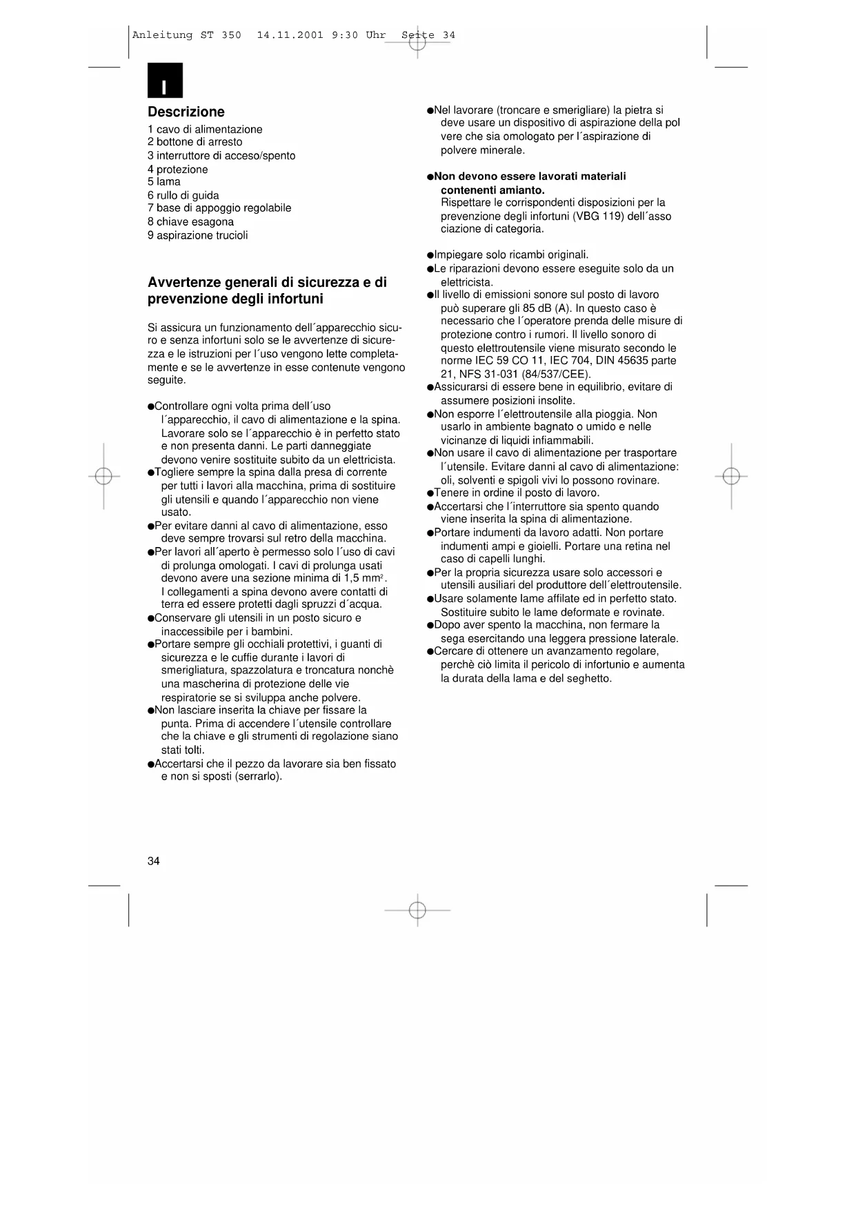 ∫fiÓÙÚ· ϷΤ Anleitung ST 350 14.11.2001 9:30 Uhr Seite 3334 Descrizione 1 cavo di alimentazione 2 bottone di arresto 3 interruttore di acceso/spento 4 protezione 5 lama 6 rullo di guida 7 base di appoggio regolabile 8 chiave esagona 9 aspirazione trucioli Avvertenze generali di sicurezza e di prevenzione degli infortuni Si assicura un funzionamento dell´apparecchio sicu- ro e senza infortuni solo se le avvertenze di sicure- zza e le istruzioni per l´uso vengono lette completa- mente e se le avvertenze in esse contenute vengono seguite. Controllare ogni volta prima dell´uso l´apparecchio, il cavo di alimentazione e la spina. Lavorare solo se l´apparecchio è in perfetto stato e non presenta danni. Le parti danneggiate devono venire sostituite subito da un elettricista. Togliere sempre la spina dalla presa di corrente per tutti i lavori alla macchina, prima di sostituire gli utensili e quando l´apparecchio non viene usato. Per evitare danni al cavo di alimentazione, esso deve sempre trovarsi sul retro della macchina. Per lavori all´aperto è permesso solo l´uso di cavi di prolunga omologati. I cavi di prolunga usati devono avere una sezione minima di 1,5 mm