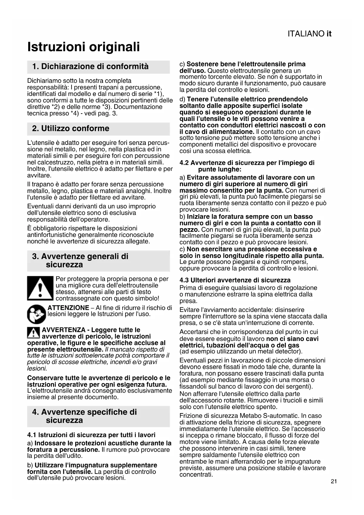 Istruzioni originali Dichiariamo sotto la nostra completa responsabilità: I presenti trapani a percussione, identificati dal modello e dal numero di serie *1), sono conformi a tutte le disposizioni pertinenti delle direttive *2) e delle norme *3). Documentazione tecnica presso *4) - vedi pag. 3. L'utensile è adatto per eseguire fori senza percus- sione nel metallo, nel legno, nella plastica ed in materiali simili e per eseguire fori con percussione nel calcestruzzo, nella pietra e in materiali simili. Inoltre, l'utensile elettrico è adatto per filettare e per avvitare. Il trapano è adatto per forare senza percussione metallo, legno, plastica e materiali analoghi. Inoltre l'utensile è adatto per filettare ed avvitare. Eventuali danni derivanti da un uso improprio dell'utensile elettrico sono di esclusiva responsabilità dell'operatore. È obbligatorio rispettare le disposizioni antinfortunistiche generalmente riconosciute nonché le avvertenze di sicurezza allegate. Per proteggere la propria persona e per una migliore cura dell'elettroutensile stesso, attenersi alle parti di testo contrassegnate con questo simbolo! ATTENZIONE – Al fine di ridurre il rischio di lesioni leggere le Istruzioni per l'uso. AVVERTENZA - Leggere tutte le avvertenze di pericolo, le istruzioni operative, le figure e le specifiche accluse al presente elettroutensile. Il mancato rispetto di tutte le istruzioni sottoelencate potrà comportare il pericolo di scosse elettriche, incendi e/o gravi lesioni. Conservare tutte le avvertenze di pericolo e le istruzioni operative per ogni esigenza futura. L'elettroutensile andrà consegnato esclusivamente insieme al presente documento.