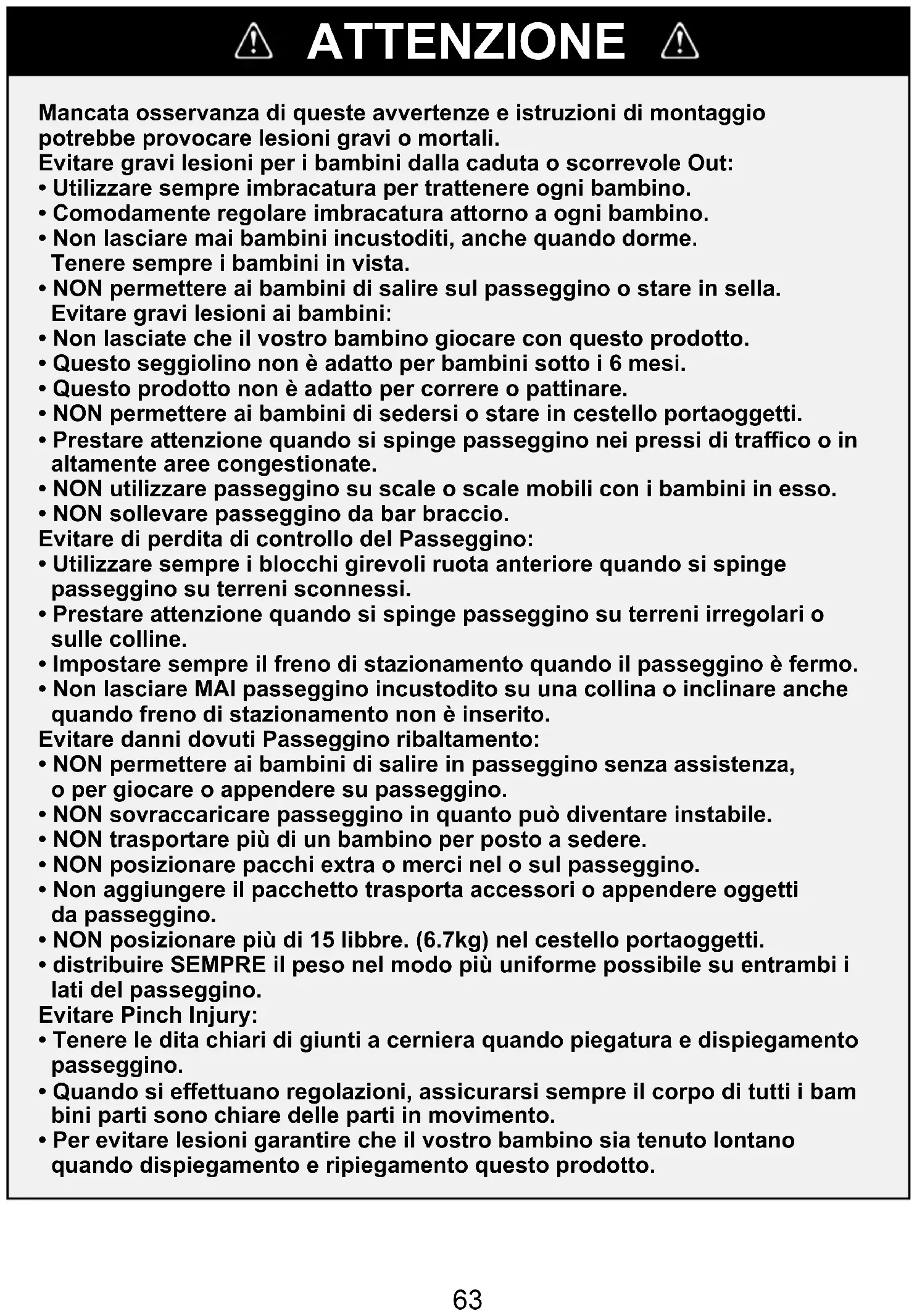 - NON permettere ai bambini di salire sul passeggino o stare in sella. Evitare gravi lesioni ai bambini: