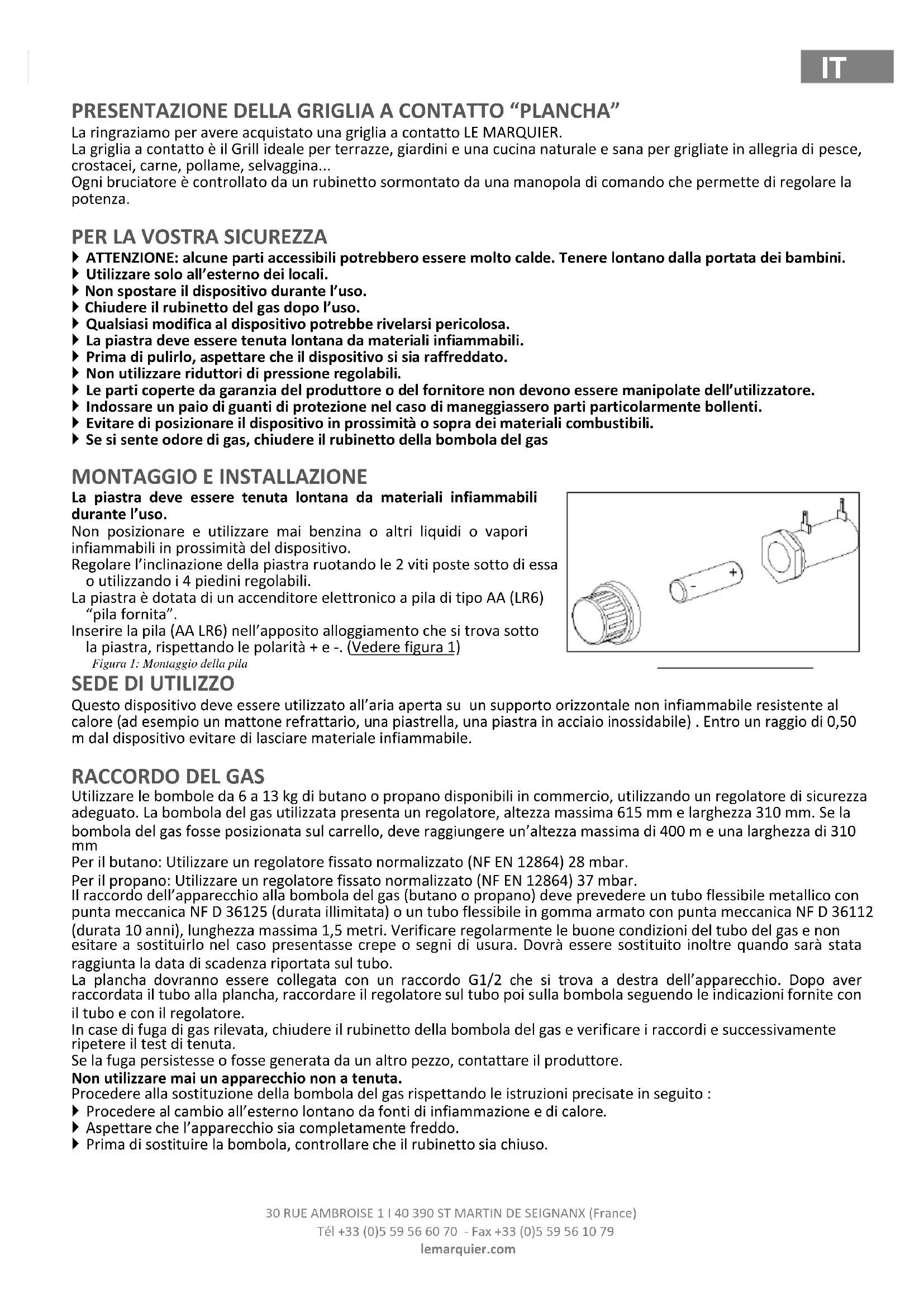 Per il butano: Utilizzare un regolatore fissato normalizzato (NF EN 12864) 28 mbar. Per il propano: Utilizzare un regolatore fissato normalizzato (NF EN 12864) 37 mbar. Il raccordo dell’apparecchio alla bombola del gas (butano o propano) deve prevedere un tubo flessibile metallico con punta meccanica NF D 36125 (durata illimitata) o un tubo flessibile in gomma armato con punta meccanica NF D 36112 (durata 10 anni), lunghezza massima 1,5 metri. Verificare regolarmente le buone condizioni del tubo del gas e non esitare a sostituirlo nel caso presentasse crepe o segni di usura. Dovrà essere sostituito inoltre quando sarà stata raggiunta la data di scadenza riportata sul tubo. La plancha dovranno essere collegata con un raccordo G1/2 che si trova a destra dell’apparecchio. Dopo aver raccordata il tubo alla plancha, raccordare il regolatore sul tubo poi sulla bombola seguendo le indicazioni fornite con il tubo e con il regolatore. In case di fuga di gas rilevata, chiudere il rubinetto della bombola del gas e verificare i raccordi e successivamente ripetere il test di tenuta. Se la fuga persistesse o fosse generata da un altro pezzo, contattare il produttore. Non utilizzare mai un apparecchio non a tenuta. Procedere alla sostituzione della bombola del gas rispettando le istruzioni precisate in seguito : Procedere al cambio all’esterno lontano da fonti di infiammazione e di calore. Aspettare che l’apparecchio sia completamente freddo. Prima di sostituire la bombola, controllare che il rubinetto sia chiuso.IT 30 RUE AMBROISE 1 I 40 390 ST MARTIN DE SEIGNANX (France) Tél +33 (0)5 59 56 60 70 - Fax +33 (0)5 59 56 10 79 lemarquier.com