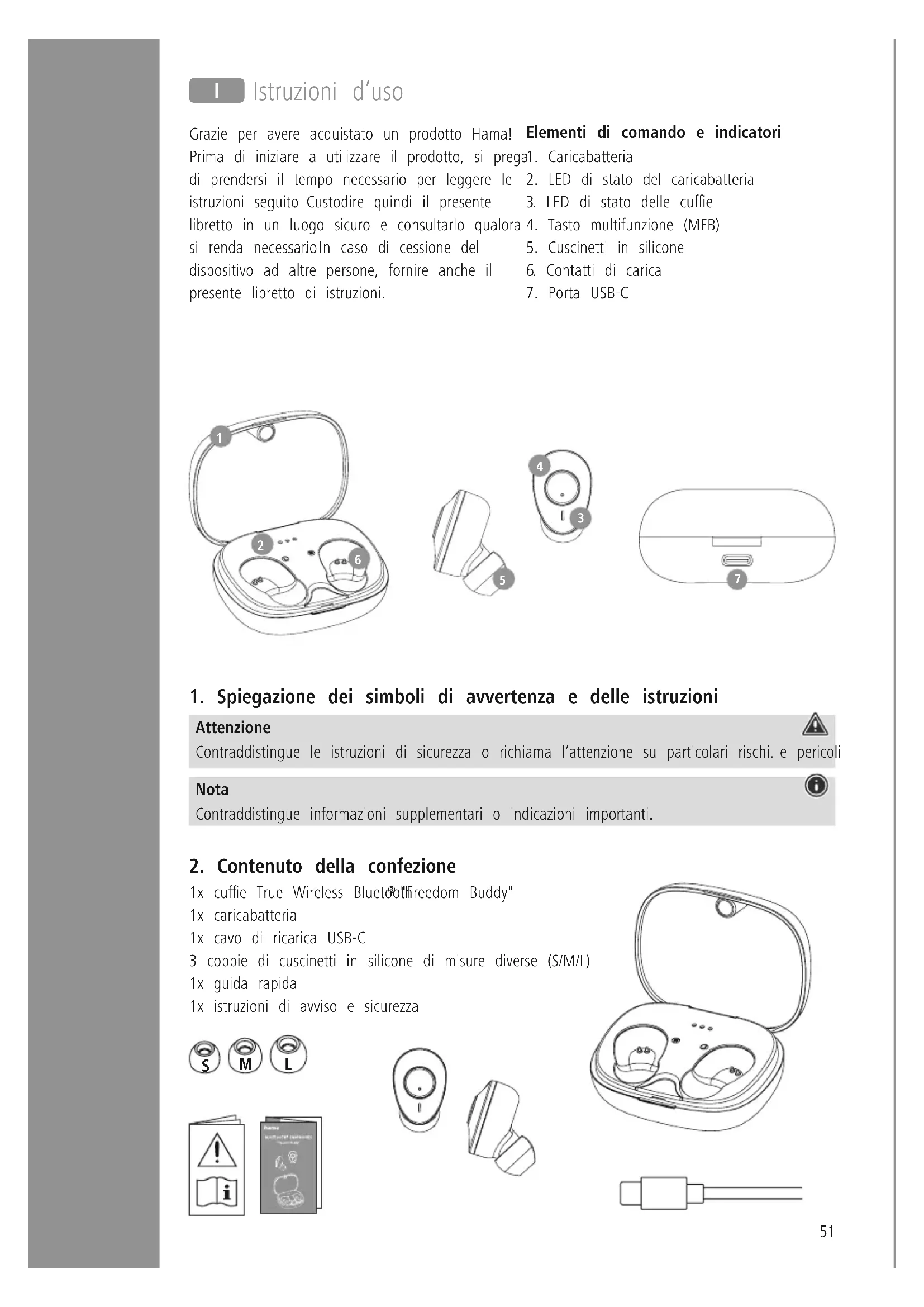 "Freedom Buddy" 1x caricabatteria 1x cavo di ricarica USB-C 3 coppie di cuscinetti in silicone di misure diverse (S/M/L) 1x guida rapida 1x istruzioni di avviso e sicurezza