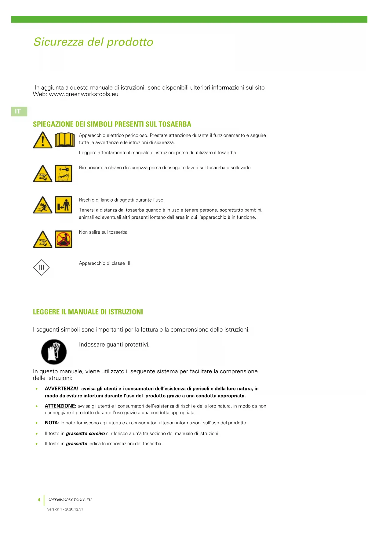 Version 1 - 2020.12.31 Le specifiche tecniche, le immagini e i materiali in questo manuale sono forniti a solo scopo di riferimento e sono privi di valore contrattuale. Il costruttore si riserva il diritto di apportare qualunque tipo di modifica a tutte le caratteristiche di funzionamento, materiali, specifiche tecniche o immagini del prodotto senza preavviso Le seguenti pagine contengono importanti istruzioni sulla sicurezza e il funzionamento. Leggere attentamente e rivedere tutte le istruzioni, le avvertenze e le precauzioni di sicurezza contenute in questo manuale. La mancata osservanza di queste istruzioni, avvertenze e precauzioni può causare infortuni o morte di persone e animali domestici o danni alle proprietà personali.GREENWORKSTOOLS.EU