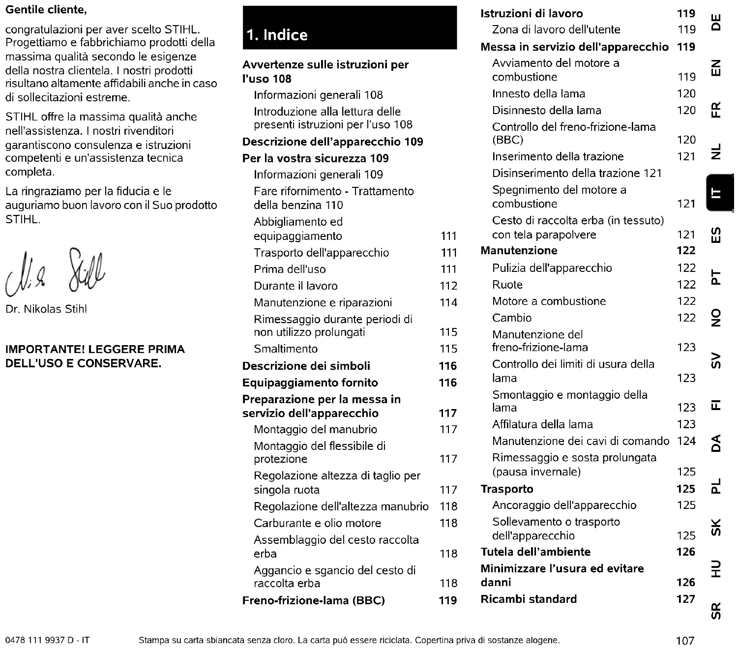 DEENFRNLESPTNOSVFIDAPLSKHUSR IT 0478 111 9937 D - IT Gentile cliente, congratulazioni per aver scelto STIHL. Progettiamo e fabbrichiamo prodotti della massima qualità secondo le esigenze della nostra clientela. I nostri prodotti risultano altamente affidabili anche in caso di sollecitazioni estreme. STIHL offre la massima qualità anche nell'assistenza. I nostri rivenditori garantiscono consulenza e istruzioni competenti e un'assistenza tecnica completa. La ringraziamo per la fiducia e le auguriamo buon lavoro con il Suo prodotto STIHL. Dr. Nikolas Stihl