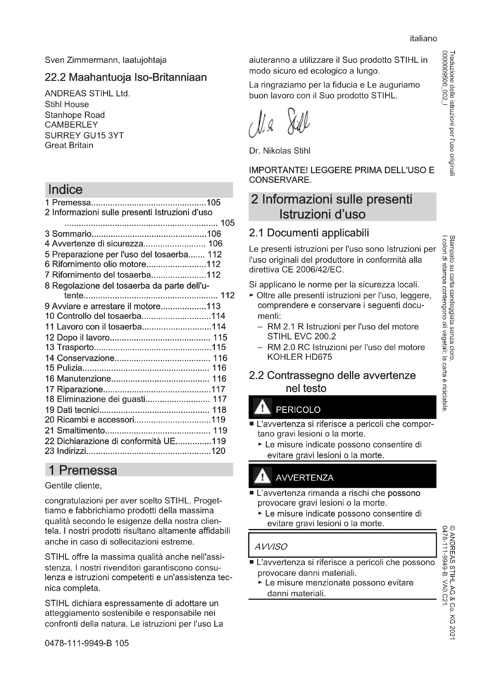 - 23 Indirizzi 1 Premessa Gentile cliente, congratulazioni per aver scelto STIHL. Proget‐ tiamo e fabbrichiamo prodotti della massima qualità secondo le esigenze della nostra clien‐ tela. I nostri prodotti risultano altamente affidabili anche in caso di sollecitazioni estreme. STIHL offre la massima qualità anche nell'assi‐ stenza. I nostri rivenditori garantiscono consu‐ lenza e istruzioni competenti e un'assistenza tec‐ nica completa. STIHL dichiara espressamente di adottare un atteggiamento sostenibile e responsabile nei confronti della natura. Le istruzioni per l'uso La aiuteranno a utilizzare il Suo prodotto STIHL in modo sicuro ed ecologico a lungo. La ringraziamo per la fiducia e Le auguriamo buon lavoro con il Suo prodotto STIHL. Dr. Nikolas Stihl p. 120
