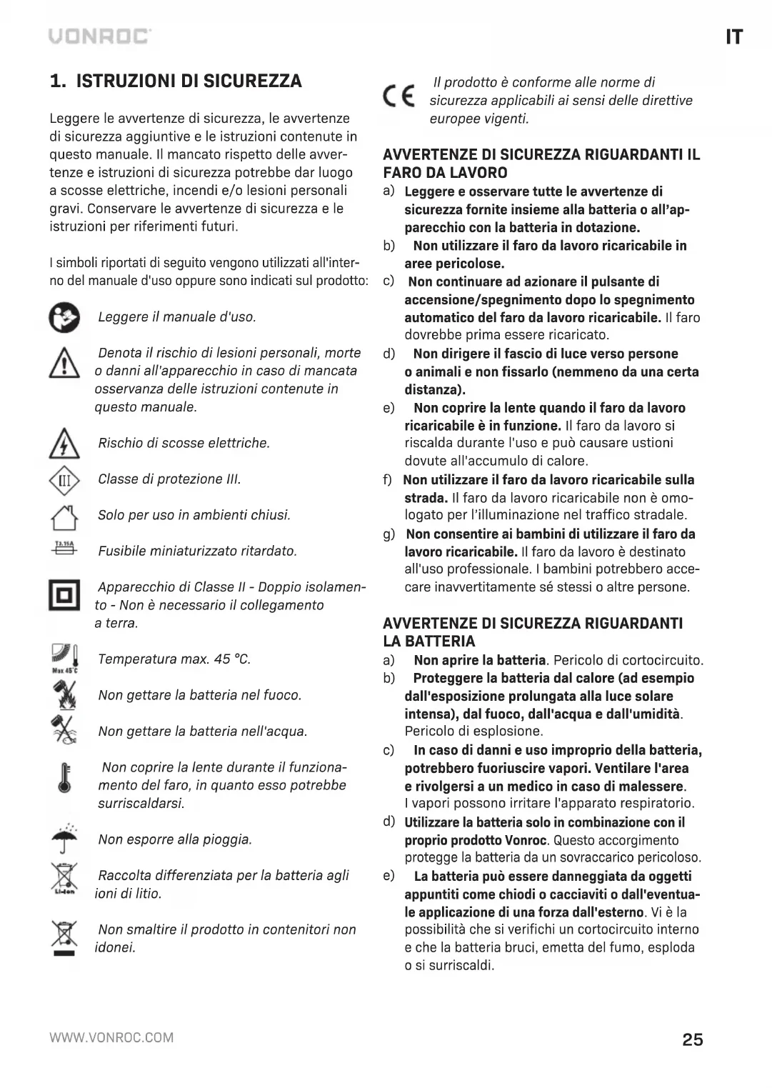 Prima di eseguire qualsiasi operazione di pulizia eintervento di manutenzione spegnere sempre l'apparecchio erimuovere la batteria. Sostituire la lampada in caso di danneggia- mento dei coperchi di vetro. Le lampade danneggiate non possono essere riparate edevono essere smaltite. La sorgente luminosa aLED di questo faro non è sostituibile. Quando la sorgente luminosa aLED giunge al termine del proprio ciclo di vita deve essere smaltita. Pulizia Pulire regolarmente la parte esterna del faro con un panno morbido, preferibilmente dopo ogni uso. Ri- muovere lo sporco particolarmente ostinato con un panno morbido inumidito con acqua esapone. Non utilizzare solventi, come benzina, alcol, ammoniaca, ecc. Le sostanze chimiche di questo tipo danneggia- no icomponenti sintetici del faro da lavoro. PROTEZIONE DELL'AMBIENTE Le apparecchiature elettriche oelettroniche difettose e/oscartate devono essere raccolte presso gli opportuni siti di riciclaggio. Solo per iPaesi CE Non smaltire gli elettroutensili insieme ai rifiuti domesti- ci. Secondo la Direttiva europea 2012/19/CE sui rifiuti delle apparecchiature elettriche ed elettroniche erela- tiva implementazione nelle normative locali, gli appa- recchi elettrici ormai inutilizzabili devono essere raccolti separatamente esmaltiti nel rispetto dell'ambiente. GARANZIA Iprodotti VONROC sono sviluppati secondo gli stan- dard di qualità più elevati esono garantiti esenti da difetti, sia per quanto riguarda imateriali che la lavorazione, per il periodo stabilito per legge ade- correre dalla data di acquisto iniziale. Se durante questo periodo il prodotto dovesse presentare dei difetti di materiali e/odi lavorazione, contattare direttamente VONROC. Le seguenti circostanze sono escluse dalla garanzia: