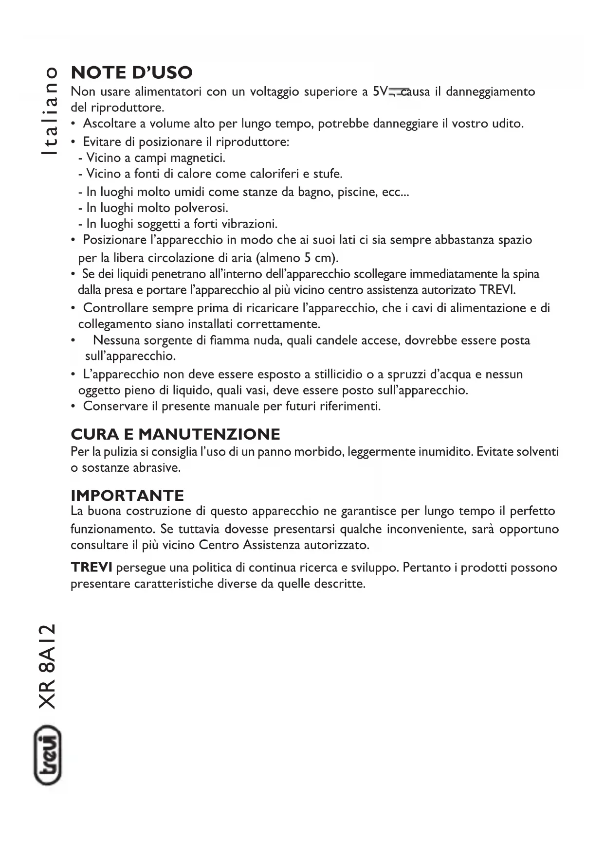 Per la pulizia si consiglia l’uso di un panno morbido, leggermente inumidito. Evitate solventi o sostanze abrasive. IMPORTANTE La buona costruzione di questo apparecchio ne garantisce per lungo tempo il perfetto funzionamento. Se tuttavia dovesse presentarsi qualche inconveniente, sarà opportuno consultare il più vicino Centro Assistenza autorizzato. TREVI persegue una politica di continua ricerca e sviluppo. Pertanto i prodotti possono presentare caratteristiche diverse da quelle descritte. ItalianoXR 8A12
