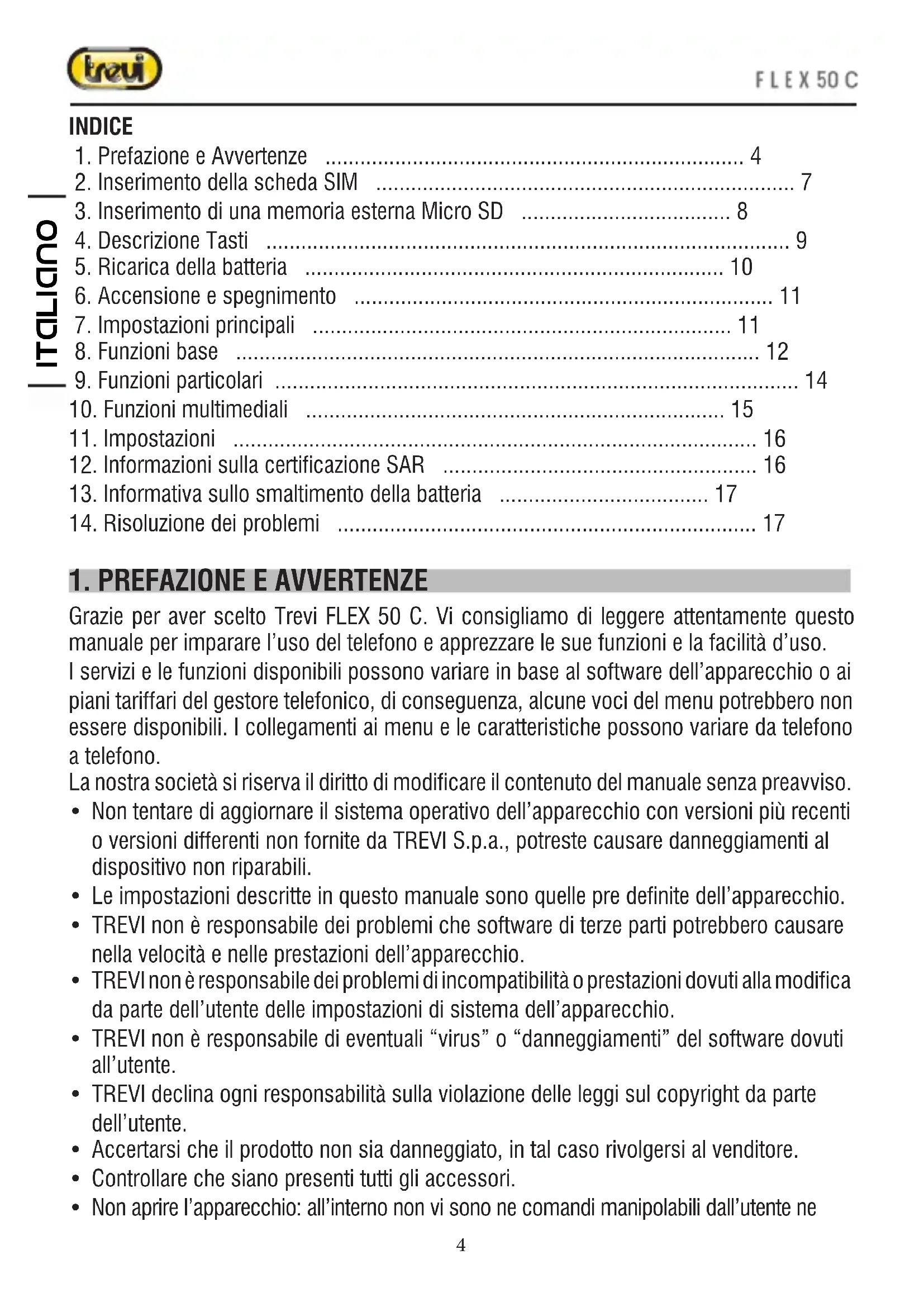Grazie per aver scelto Trevi FLEX 50 C. Vi consigliamo di leggere attentamente questo manuale per imparare l’uso del telefono e apprezzare le sue funzioni e la facilità d’uso. I servizi e le funzioni disponibili possono variare in base al software dell’apparecchio o ai piani tariffari del gestore telefonico, di conseguenza, alcune voci del menu potrebbero non essere disponibili. I collegamenti ai menu e le caratteristiche possono variare da telefono a telefono. La nostra società si riserva il diritto di modificare il contenuto del manuale senza preavviso.