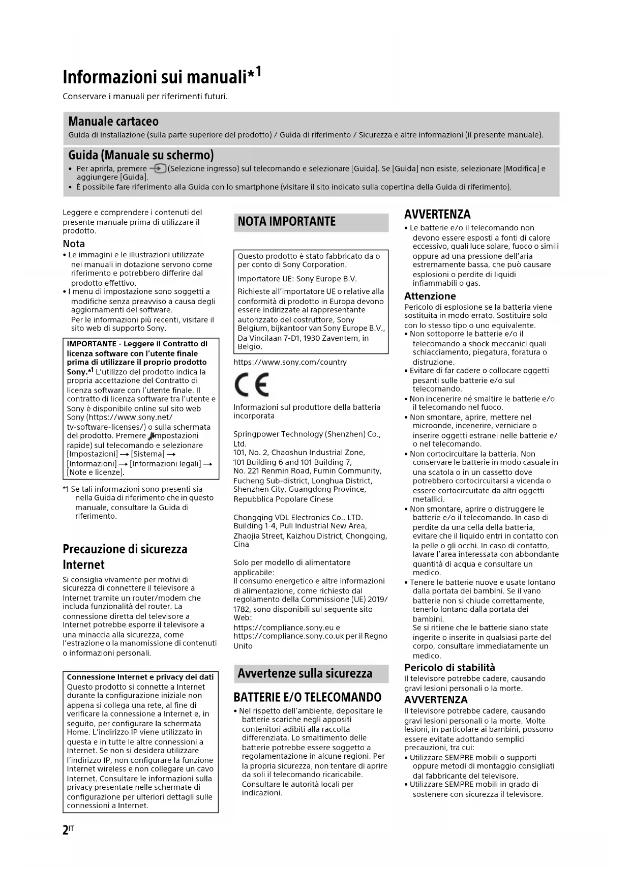 - Le immagini e le illustrazioni utilizzate nei manuali in dotazione servono come riferimento e potrebbero differire dal prodotto effettivo.• I menu di impostazione sono soggetti a modifiche senza preavviso a causa degli aggiornamenti del software.Per le informazioni più recenti, visitare il sito web di supporto Sony. Precauzione di sicurezza Internet Si consiglia vivamente per motivi di sicurezza di connettere il televisore a Internet tramite un router/modem che includa funzionalità del router. La connessione diretta del televisore a Internet potrebbe esporre il televisore a una minaccia alla sicurezza, come l’estrazione o la manomissione di contenuti o informazioni personali.https://www.sony.com/countryInformazioni sul produttore della batteria incorporataSpringpower Technology (Shenzhen) Co., Ltd. 101, No. 2, Chaoshun Industrial Zone, 101 Building 6 and 101 Building 7, No. 221 Renmin Road, Fumin Community, Fucheng Sub-district, Longhua District, Shenzhen City, Guangdong Province, Repubblica Popolare CineseChongqing VDL Electronics Co., LTD.Building 1-4, Puli Industrial New Area, Zhaojia Street, Kaizhou District, Chongqing, Cina Solo per modello di alimentatore applicabile:Il consumo energetico e altre informazioni di alimentazione, come richiesto dal regolamento della Commissione (UE) 2019/1782, sono disponibili sul seguente sito Web: https://compliance.sony.eu ehttps://compliance.sony.co.uk per il Regno Unito