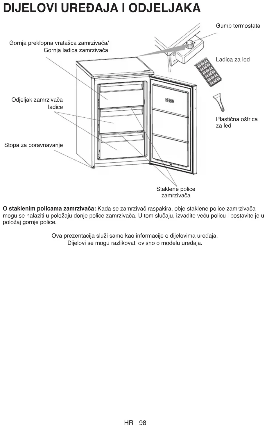 Informazioni sui ripiani di vetro del freezer: Quando il freezer viene tolto dall’imballo, entrambi i ripiani di vetro del freezer potrebbero essere in posi- zione inferiore. In questo caso, togliere il ripiano più grande e metterlo in posizione superiore. Questa presentazione è puramente informativa sui componenti dell’apparecchio. I componenti potrebbero variare secondo il modello dell’apparecchio. Sportello del vano di congelazione Termostato Vaschetta del ghiaccio Raschietto in plastica Ripiani in vetro congelatore Cassetto scomparto congelazione Rapida Cassetto inferiore scomparto Congelatore52292646 (10724745-10724756)