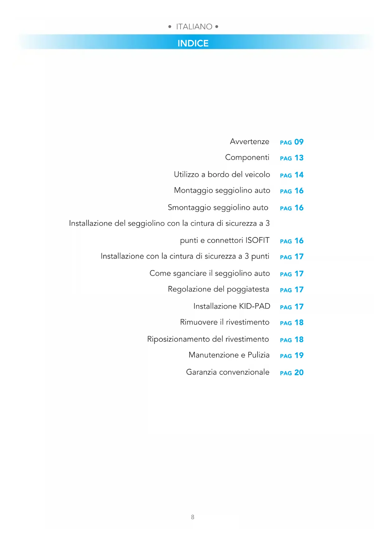 INDICE pag 09 pag 13 pag 14 pag 16 pag 16 pag 16 pag 17 pag 17 pag 17 pag 17 pag 18 pag 18 pag 19 pag 20 Avvertenze Componenti Utilizzo a bordo del veicolo Montaggio seggiolino auto Smontaggio seggiolino auto Installazione del seggiolino con la cintura di sicurezza a 3 punti e connettori ISOFIT Installazione con la cintura di sicurezza a 3 punti Come sganciare il seggiolino auto Regolazione del poggiatesta Installazione KID-PAD Rimuovere il rivestimento Riposizionamento del rivestimento Manutenzione e Pulizia Garanzia convenzionale AVVERTENZE• ITALIANO •