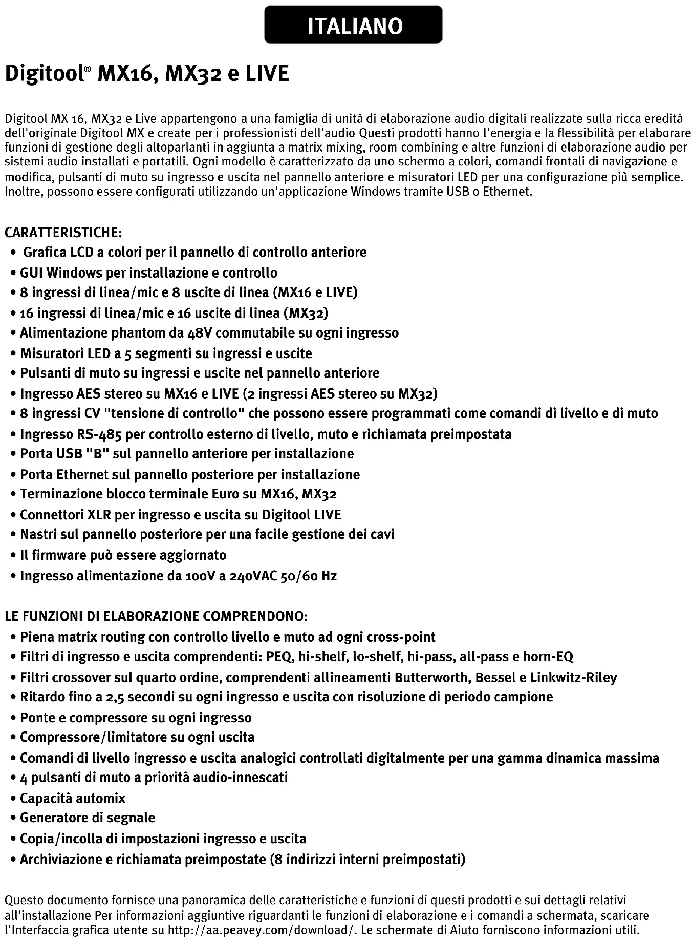 MX16, MX32 e LIVE Digitool MX 16, MX32 e Live appartengono a una famiglia di unità di elaborazione audio digitali realizzate sulla ricca eredità dell'originale Digitool MX e create per i professionisti dell'audio Questi prodotti hanno l'energia e la flessibilità per elaborare funzioni di gestione degli altoparlanti in aggiunta a matrix mixing, room combining e altre funzioni di elaborazione audio per sistemi audio installati e portatili. Ogni modello è caratterizzato da uno schermo a colori, comandi frontali di navigazione e modifica, pulsanti di muto su ingresso e uscita nel pannello anteriore e misuratori LED per una configurazione più semplice. Inoltre, possono essere configurati utilizzando un'applicazione Windows tramite USB o Ethernet. CARATTERISTICHE: